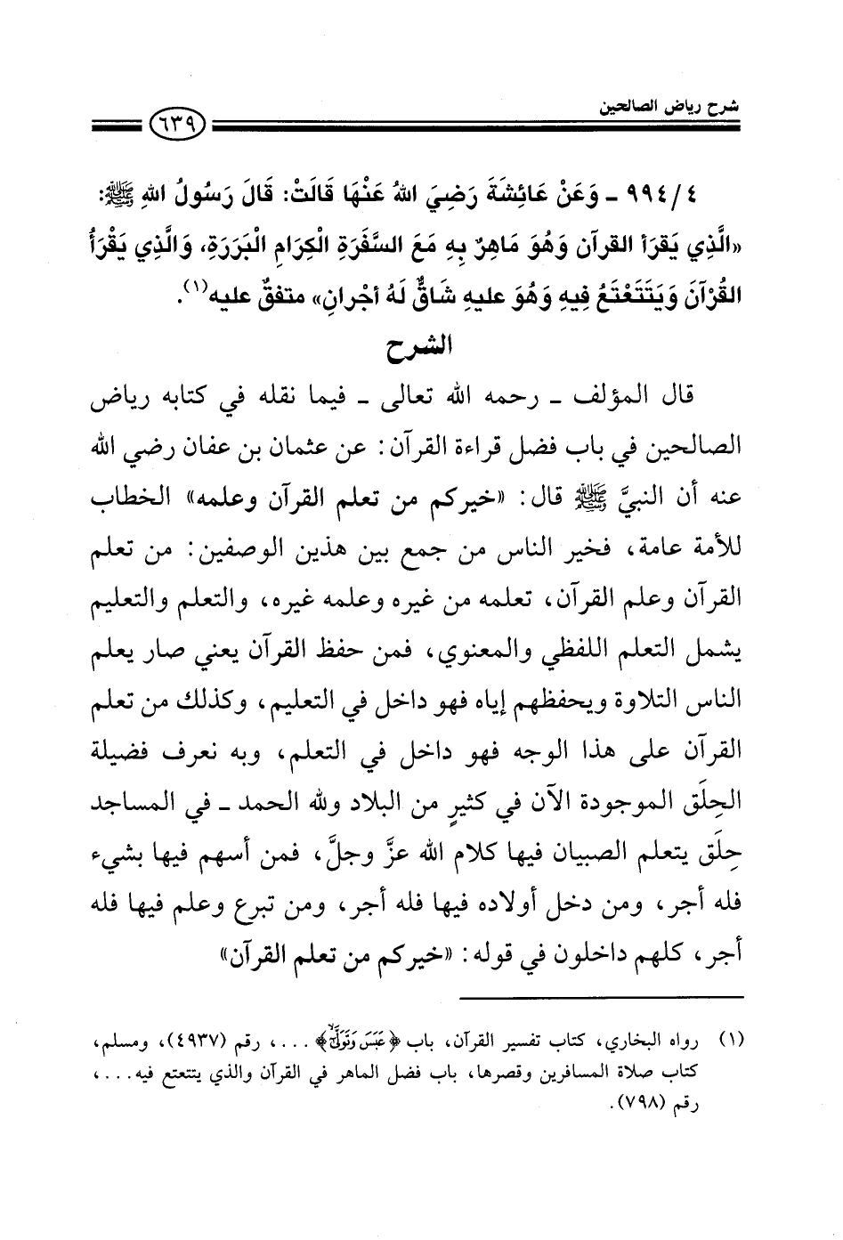 EXقال المؤلف رحمه الله تعالى فيما نقله في كتابه رياض الصالحين باب فضل قراءة القرآن عن عثمان بن عفان رضي الله عنه أن النبي صلى الله عليه وسلم قال خيركم من تعلم القرآن وعلمه الخطاب للأمة عامة فخير الناس من جمع بين هذين الوصفين من تعلم القرآن وعلم القرآن تعلمه من غيره وعلمه غيره والتعلم والتعليم يشمل التعلم اللفظي والمعنوي فمن حفظ القرآن يعني صار يعلم الناس التلاوة ويحفظهم إياه فهو داخل في التعليم وكذلك من تعلم القرآن على هذا الوجه فهو داخل في التعلم وبه نعرف فضيلة الحلق الموجودة الآن في كثير من البلاد ولله الحمد في المساجد حيث يتعلم الصبيان فيها كلام الله عز وجل فمن ساهم فيها بشيء فله أجر ومن أدخل أولاده فيها فله أجر ومن تبرع وعلم فيها فله أجر كلهم داخلون في قوله خيركم من تعلم القرآن وعلمه