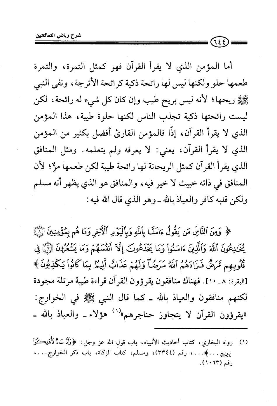 أما المؤمن الذي لا يقرأ القرآن فهو كمثل التمرة طعمها حلو ولكن ليس لها رائحة ذكية كرائحة الأترجة ونفى النبي صلى الله عليه وسلم ريحها لأنه ليس بريح طيب وإن كان كل شيء له رائحة لكن ليست رائحتها ذكية لكنها حلوة طيبة هذا المؤمن الذي لا يقرأ القرآن إذا فالمؤمن القارئ للقرآن أفضل بكثير من الذي لا يقرأ القرآن ومعنى لا يقرؤه يعني لا يعرفه ولم يتعلمه ومثل المنافق الذي يقرأ القرآن كمثل الريحانة لها رائحة طيبة لكن طعمها مر لأن المنافق في ذاته خبيث لا خير فيه والمنافق هو الذي يظهر أنه مسلم ولكن قلبه كافر والعياذ بالله هو الذي قال الله فيه ومن الناس يقول آمنا بالله وباليوم الأخر وما هم بمؤمنين يخادعون الله والذين آمنوا وما يخادعون إلا أنفسهم وما يشعرون في قلوبهم مرض فزادهم الله مرضا ولهم عذاب أليم بما كانوا يكذبون يوجد منافقون يقرءون القرآن قراءة طيبة مرتلة مجودة لكنهم منافقون والعياذ بالله كما قال النبي صلى الله عليه وسلم في الخوارج يقرءون القرآن لا يتجاوز حناجرهم هؤلاء والعياذ بالله