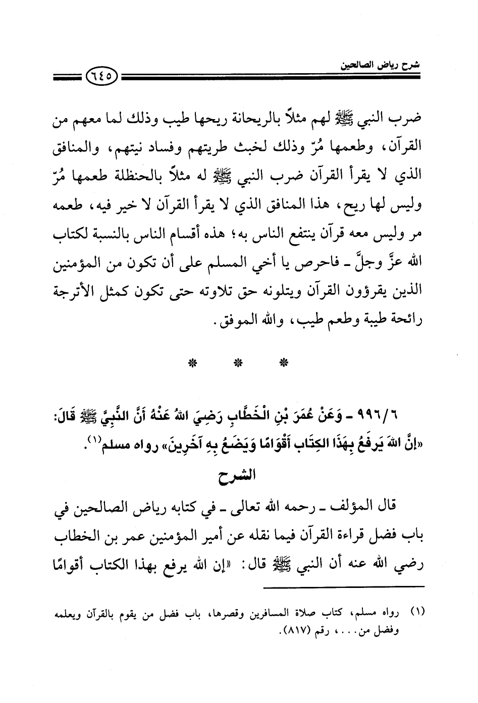996 - وعن عمر بن الخطاب رضي الله عنه أن النبي صلى الله عليه وسلم قال إن الله يرفع بهذا الكتاب أقواما ويضع به آخرين رواه مسلم