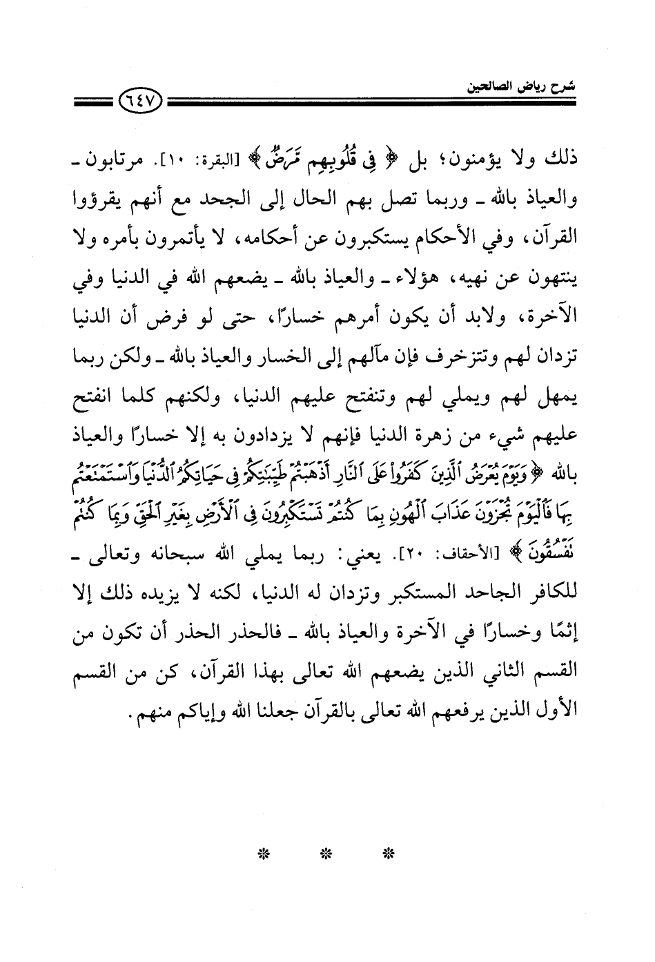 ذلك ولا يؤمنون بل {في قلوبهم مرض} مرتابون والعياذ بالله وربما يصل بهم الحال إلى الجحد مع أنهم يقرءون القرآن وفي الأحكام يستكبرون لا يأتمرون بأمره ولا ينتهون بنهيه هؤلاء والعياذ بالله يضعهم الله في الدنيا والآخرة ولابد أن يكون أمرهم خسارا حتى لو فرض أن الدنيا دانت لهم وتزخرفت فإن مآلهم إلى الخسار والعياذ بالله ولكن ربما يمهل لهم ويملي لهم وتنفتح عليهم الدنيا ولكنهم كلما انفتح عليهم شيء من زهرة الدنيا فإنهم لا يزدادون به إلا خسارا والعياذ بالله {ويوم يعرض الذين كفروا على النار أذهبتم طيباتكم في حياتكم الدنيا واستمتعتم بها فاليوم تجزون عذاب الهون بما كنتم تستكبرون في الأرض بغير الحق وبما كنتم تفسقون} يعني ربما يمهل الله سبحانه وتعالى للكافر الجاحد المستكبر وتزدان له الدنيا لكنه لا يزيده ذلك إلا خسارا وإنما في الآخرة والعياذ بالله فالحذر الحذر أن تكون من القسم الثاني يضعهم الله بهذا القرآن كن من القسم الأول الذين يرفعهم الله بالقرآن جعلنا الله وإياكم منهم