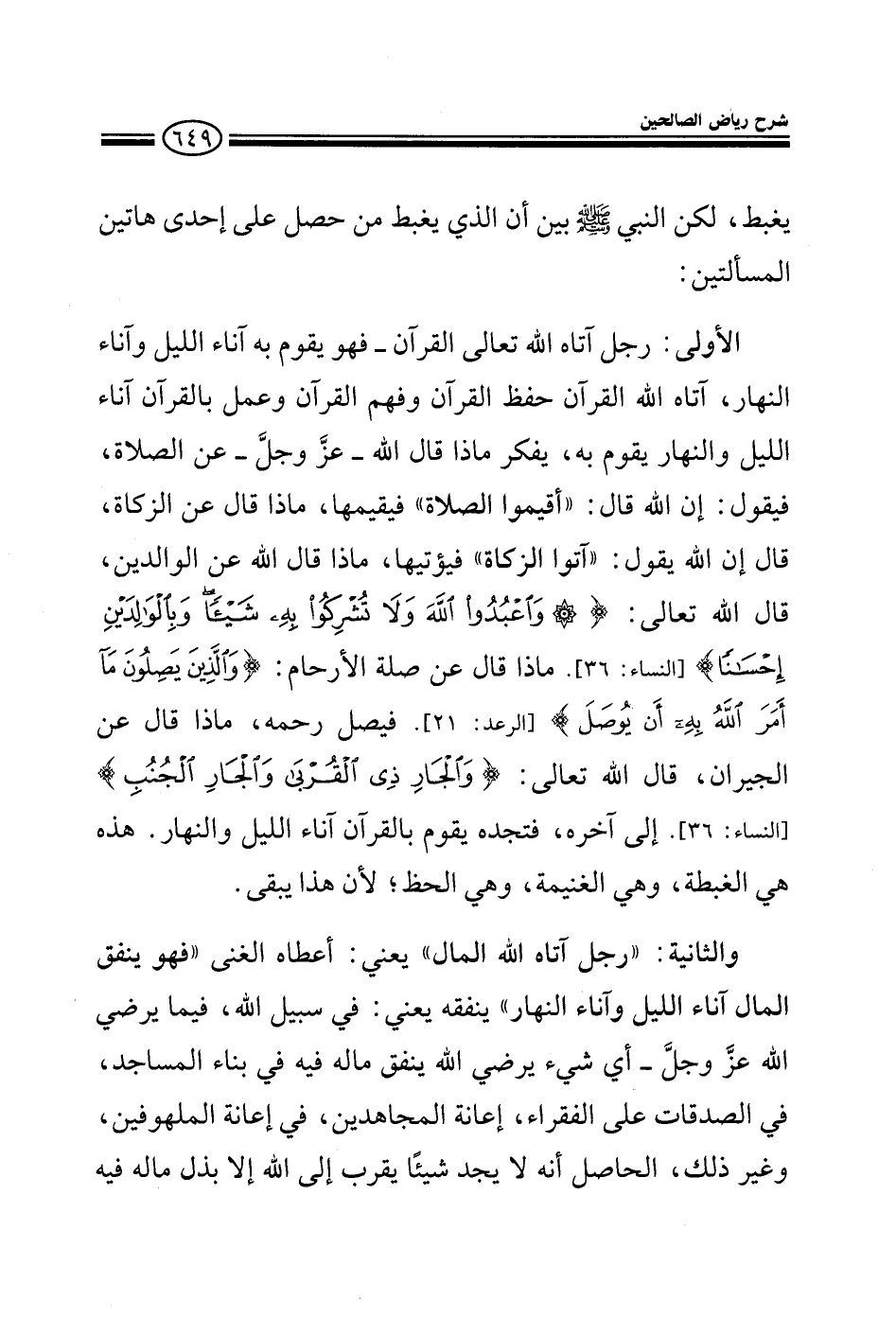 الحظ لكن النبي صلى الله عليه وسلم بين أن الذي يغبط من حصل على هذين الاثنين الأولى آتاه الله تعالى الحكمة القرآن فهو يقوم به آناء الليل وآناء النهار آتاه الله القرآن حفظه وفهمه وعمل به آناء الليل والنهار يقوم به يفكر ماذا قال الله عز وجل عن الصلاة فيقول أقيموا الصلاة فيقيمها ماذا قال عن الزكاة فيقول {وءاتوا الزكاة} فيؤتيها ماذا قال عن الوالدين قال الله تعالى {واعبدوا الله ولا تشركوا به شيئا وبالوالدين إحسانا} وماذا قال عن صلة الأرحام {والذين يصلون ما أمر الله به أن يوصل} فيصل رحمه ماذا قال عن الجيران قال تعالى {والجار ذي القربى والجار الجنب} إلى آخره فتجده يقوم بالقرآن آناء الليل والنهار هذه هي الغبطة وهي الغنيمة وهي الحظ والثاني رجل آتاه الله المال يعني صار غنيا فهو ينفقه آناء الليل وآناء النهار يعني في سبيل الله فيما يرضي الله عز وجل أي شيء يرضي الله ينفق ماله فيه بناء المساجد الصدقات على الفقراء إعانة المجاهدين إعانة الملهوفين وغير ذلك المهم لا يجد شيئا يقرب إلى الله إلا بذل ماله فيه