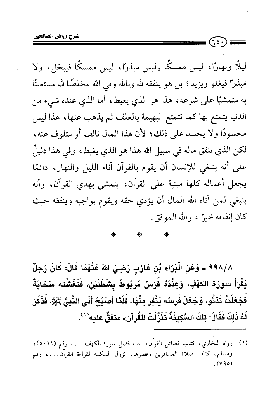 998 - وعن البراء بن عازب رضي الله عنهما قال كان رجل يقرأ سورة الكهف وعنده فرس مربوط بشطنين فتغشته سحابة فجعلت تدنو وجعل فرس ينفر منها فلما أصبح أتى النبي صلى الله عليه وسلم فذكر له ذلك فقال تلك السكينة تنزلت للقرآن متفق عليه