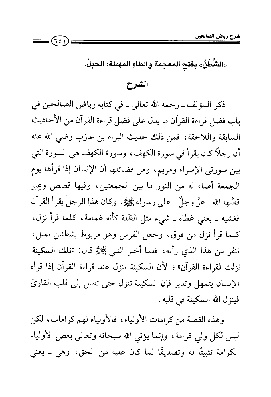 EXذكر المؤلف النووي رحمه الله في كتاب رياض الصالحين في باب فضل قراءة القرآن ما يدل على فضل قراءة القرآن من الأحاديث السابقة واللاحقة فمن ذلك حديث البراء بن عازب رضي الله عنه أن رجلا كان يقرأ في سورة الكهف وسورة الكهف هي التي بين الإسراء ومريم هذه السورة من فضائلها أن الإنسان إذا قرأها يوم الجمعة أضاء له ما بين الجمعتين وفيها قصص وعبر قصها الله عز وجل على رسوله صلى الله عليه وسلم وكان هذا الرجل يقرأ القرآن فغشاه يعني غطاه شيء مثل الظلة كأنه غمامة كلما قرأ نزل كلما قرا نزل من فوق وجعلت الفرس وهي مربوطة بشطنين جعلت تميل تنفر من هذا الذي رأته فلما أخبر النبي صلى الله عليه وسلم قال تلك السكينة نزلت لقراءة القرآن لأن السكينة تنزل عند قراءة القرآن إذا قرأه الإنسان بتمهل وتدبر فإن السكينة تنزل حتى تصل إلى قلب القارئ فينزل الله السكينة في قلبه وهذه القصة من كرامات الأولياء والأولياء لهم كرامات لكن ليس لكل ولي كرامة إنما يؤتى الله بعض أوليائه كرامة تثبيتا له وتصديقا لما كان عليه من الحق وهي يعني