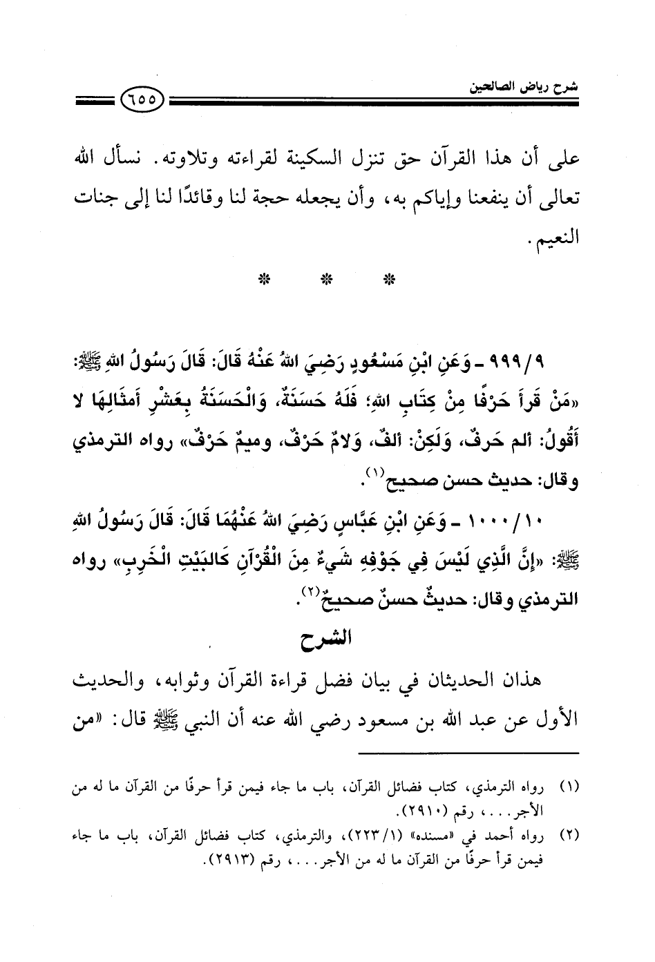 999 - وعن ابن مسعود رضي الله عنه قال قال رسول الله صلى الله عليه وسلم من قرأ حرفا من كتاب الله فله حسنة والحسنة بعشر أمثالها لا أقول ألم حرف ولكن ألف حرف ولام حرف وميم حرف رواه الترمذي وقال حديث حسن صحيح