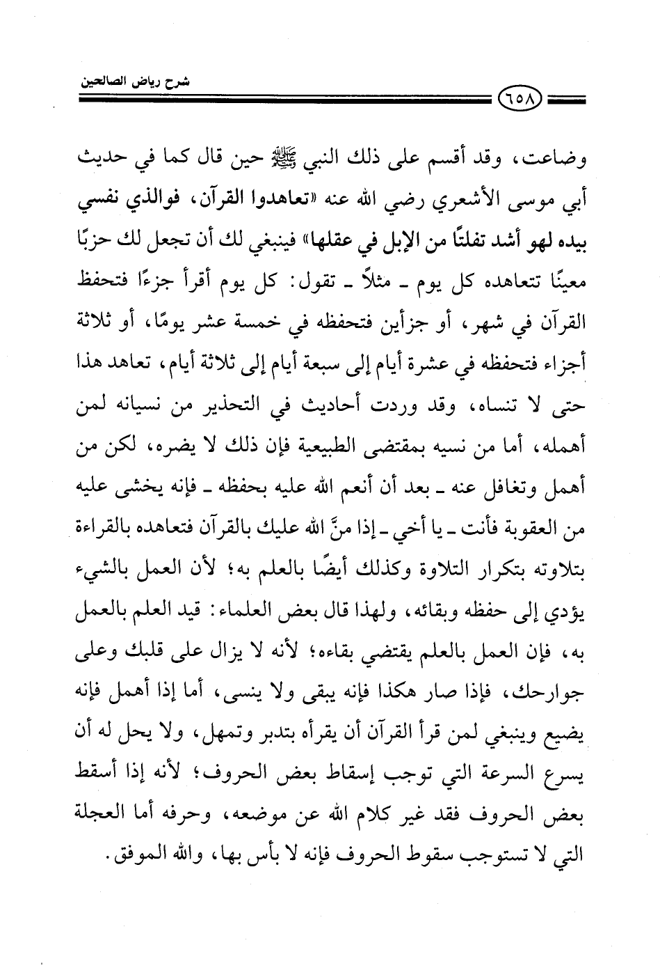 وضاعت وقد أقسم على ذلك النبي صلى الله عليه وسلم حين قال كما في حديث أبي موسى الأشعري رضي الله عنه تعاهدوا القرآن فوالذي نفسي بيده لهو أشد تفلتا من الإبل في عقلها فينبغي لك أن تجعل لك حزبا معينا تتعاهده كل يوم مثلا تقول كل يوم أقرأ جزءا فتختم القرآن في شهر أو جزأين فتختمه في خمسة عشر يوما أو ثلاثا أجزاء فتختمه في عشرة أيام إلى تسعة أيام إلى ثلاثة أيام تعاهد هذا حتى لا تنساه وقد وردت أحاديث في التحذير من نسيانه لمن أهمله أما من نساه بمقتضى الطبيعة فإنه لا يضر لكن من أهمل وتغافل عنه بعد أن أنعم الله عليه بحفظه فإنه يخشى عليه من العقوبة فأنت يا أخي إذا من الله عليك بالقرآن فتعاهده بالقراءة بتلاوته بتكرار التلاوة وكذلك أيضا بالعمل به لأن العمل بالشيء يؤدي إلى حفظه وبقائه ولهذا قال بعض العلماء قيد العلم بالعمل به فإن العمل بالعلم يقتضي بقاءه لأنه لا يزال على قلبك وعلى جوارحك فإذا صار هكذا فإنه يبقى ولا ينسى أما إذا أهمل فإنه يضيع وينبغي لمن قرأ القرآن أن يقرأه بتدبر وتمهل ولا يحل له أن يسرع السرعة التي توجب إسقاط بعض الحروف لأنه إذا أسقط بعض الحروف فقد غير كلام الله من موضعه وحرفه أما العجلة التي لا تستوجب سقوط الحروف فإنه لا بأس بها والله الموفق