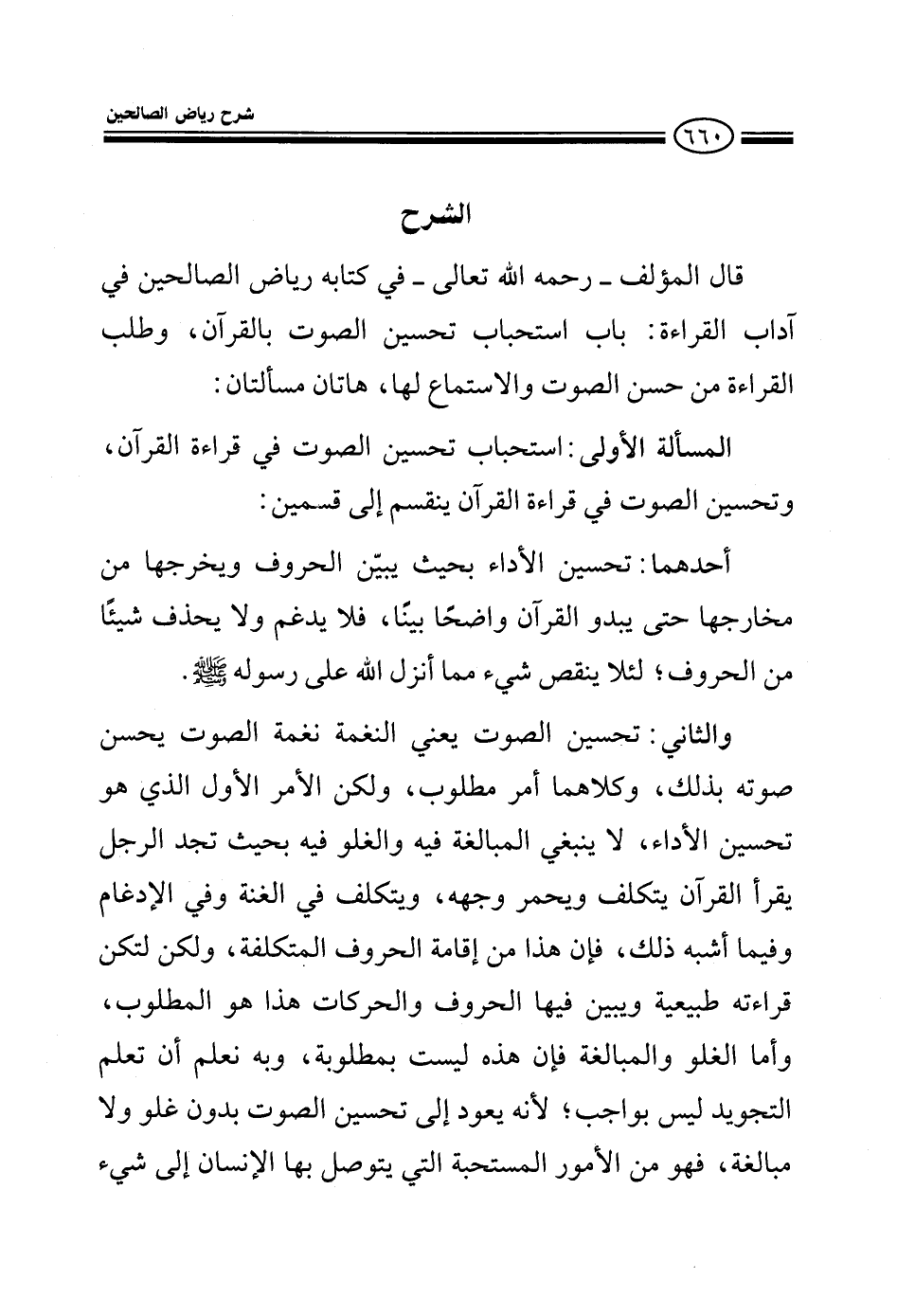 EXقال المؤلف رحمه الله في كتابه (رياض الصالحين) في آداب القراءة باب استحباب تحسين الصوت بالقراءة وطلب القراءة من حسن الصوت والاستماع إليه هاتان مسألتان: المسألة الأولى استحباب تحسين الصوت في قراءة القرآن وتحسين الصوت ينقسم إلى قسمين أحدهما تحسين الأداء بحيث يبين الحروف ويخرجها من مخارجها حتى يبدو القرآن واضحا بينا فلا يخفى ولا يحذف شيء من الحروف لئلا ينقص شيء مما أنزله الله على رسوله صلى الله عليه وسلم.