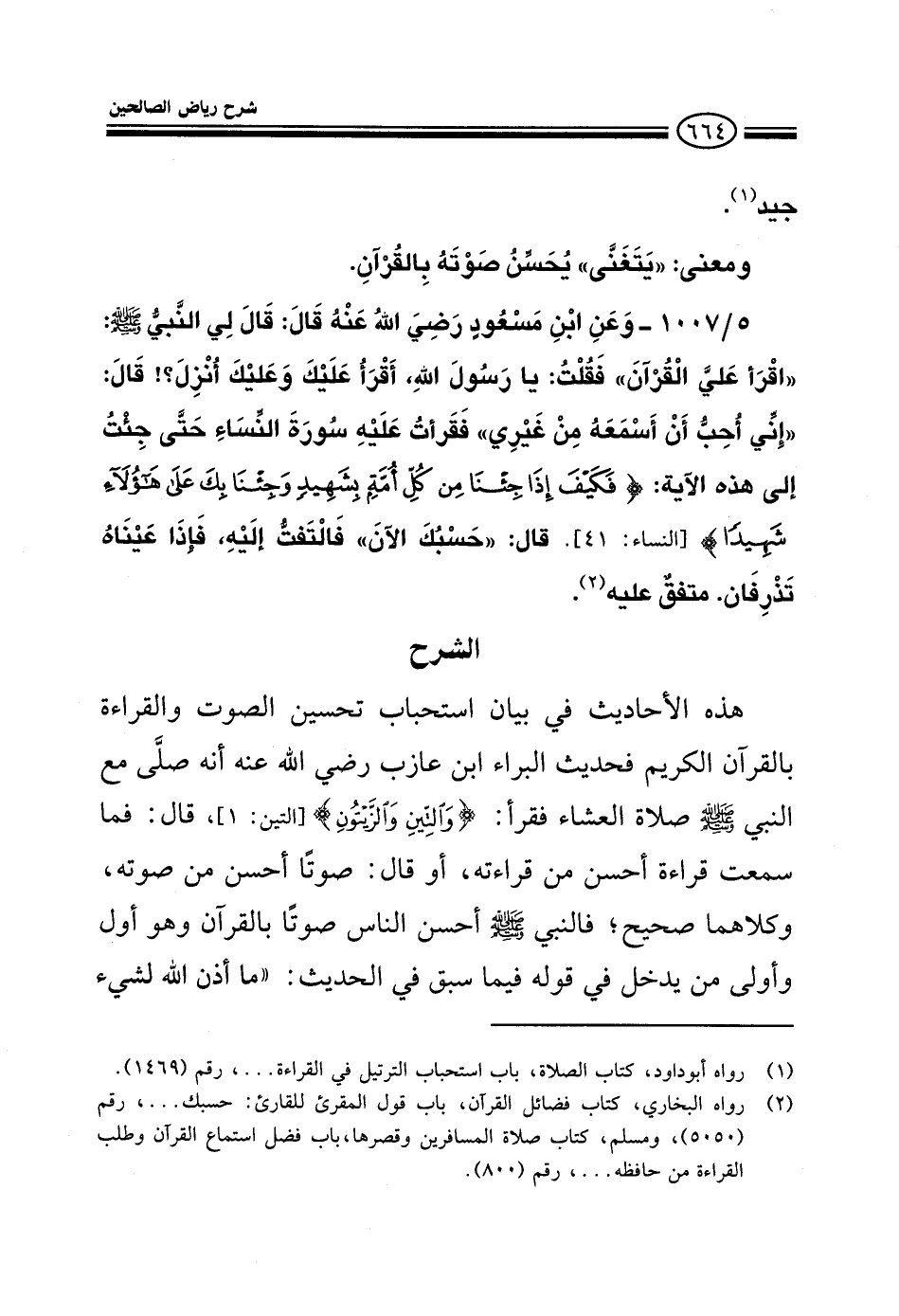 1008 - وعن ابن مسعود رضي الله عنه قال قال لي النبي صلى الله عليه وسلم اقرأ علي القرآن فقلت يا رسول الله أقرأ عليك وعليك أنزل قال إني أحب أن أسمعه من غيري فقرأت عليه سورة النساء حتى جئت إلى هذه الآية {فكيف إذا جئنا من كل أمة بشهيد وجئنا بك على هؤلاء شهيدا} قال حسبك الآن فالتفت إليه فإذا عيناه تذرفان متفق عليه.