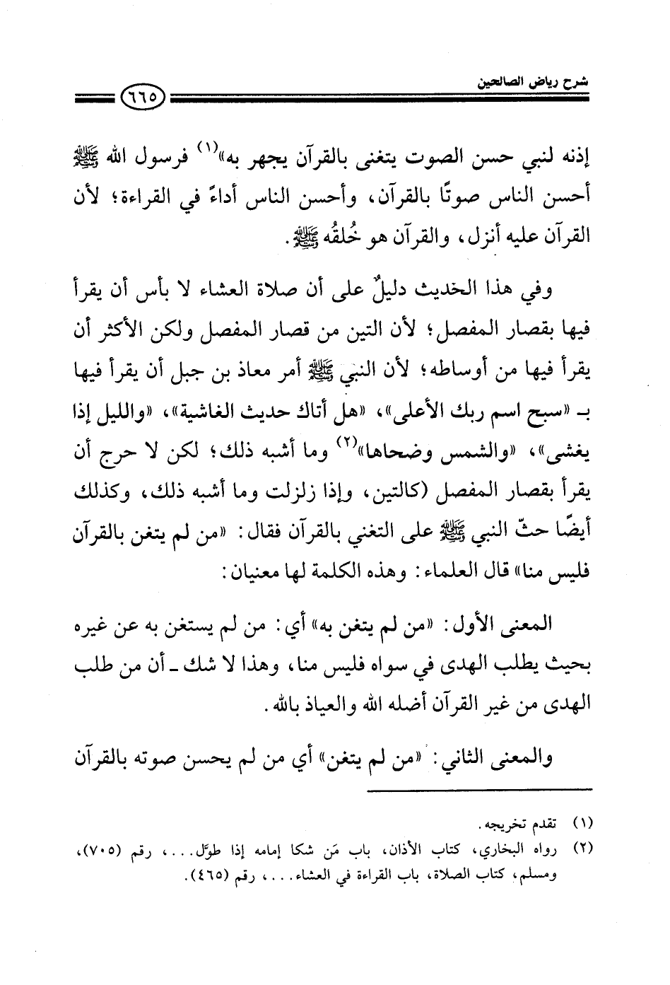 وفي هذا الحديث دليل على أن صلاة العشاء لا بأس أن يقرأ فيها بقصار المفصل لأن سورة التين من قصار المفصل ولكن الأكثر أن يقرأ فيها من أوساطه لأن النبي صلى الله عليه وسلم أمر معاذ بن جبل أن يقرأ فيها بـ (سبح اسم ربك الأعلى) (هل أتاك حديث الغاشية) (والليل إذا يغشى) (والشمس وضحاها) وما أشبه ذلك لكن لا حرج أن يقرأ بقصار المفصل (كالتين وإذا زلزلت) وما أشبه ذلك وكذلك أيضا حث النبي صلى الله عليه وسلم على التغني بالقرآن وقال من لم يتغن بالقرآن فليس منا.