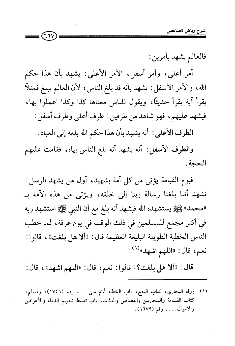 أمر أعلى وأمر أسفل الأمر الأعلى يشهد بأن هذا حكم الله والأمر الأسفل يشهد لأنه قد بلغ الناس لأن العالم يبلغ فمثلا يقرأ آية حديثا ويقول للناس معناها كذا وكذا اعلموا بها فيشهد عليهم فهو شاهد من طرفين طرف أعلى وطرف أسفل الطرف الأعلى أنه يشهد بأن هذا حكم الله بلغه للعباد والأسفل أنه يشهد أنه بلغ الناس به فقامت عليهم الحجة فيوم القيامة يؤتى من كل أمة بشهيد وأول من يشهد الرسل نشهد أننا بلغنا رسالة ربنا إلى خلقه ويؤتى من هذه الأمة بـ محمد صلى الله عليه وسلم يستشهده الله فيشهد أنه بلغ مع أن النبي صلى الله عليه وسلم استشهد ربه في أكبر مجمع للمسلمين في ذلك الوقت في يوم عرفة لما خطب الناس الخطبة الطويلة العظيمة البليغة قال ألا هل بلغت قالوا نعم قال اللهم اشهد قال ألا هل بلغت قالوا نعم قال اللهم اشهد قال