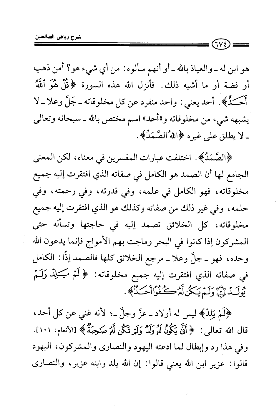 {الله الصمد} الصمد اختلفت عبارات المفسرين في معناه لكن المعنى الجامع لها أن الصمد هو الكامل في صفاته الذي افتقرت إليه جميع مخلوقاته فهو الكامل في علمه في قدرته في رحمته في حلمه وفي غير ذلك من صفاته وكذلك هو الذي افتقرت إليه جميع مخلوقاته كل الخلائق تصمد إليه في حاجتها وتسأله حتى المشركون إذا كانوا في البحر وماجت الأمواج فإنما يدعون الله وحده فهو جل وعلا مرجع الخلائق كلها فالصمد إذا معناه الكامل في صفاته الذي افتقرت إليه جميع مخلوقاته {لم يلد ولم يولد ولم يكن له كفوا أحد} لم يلد ليس له أولاد عز وجل لأنه غني عن كل أحد قال الله تعالى {أنى يكون له ولد ولم تكن له صاحبة} وفي هذا رد وإبطال لما ادعته اليهود والنصارى والمشركون اليهود قالوا عزيز ابن الله يعني قالوا إله يلد وابنه عزير والنصارى