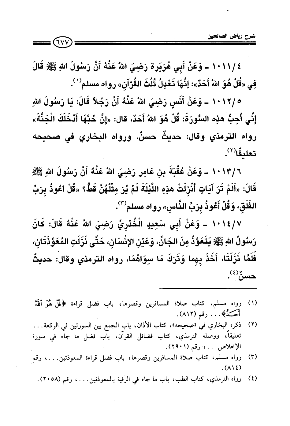 1012 - وعن أبي هريرة رضي الله عنه أن رسول الله صلى الله عليه وسلم قال في {قل هو الله أحد} إنها ثلث القرآن رواه مسلم.