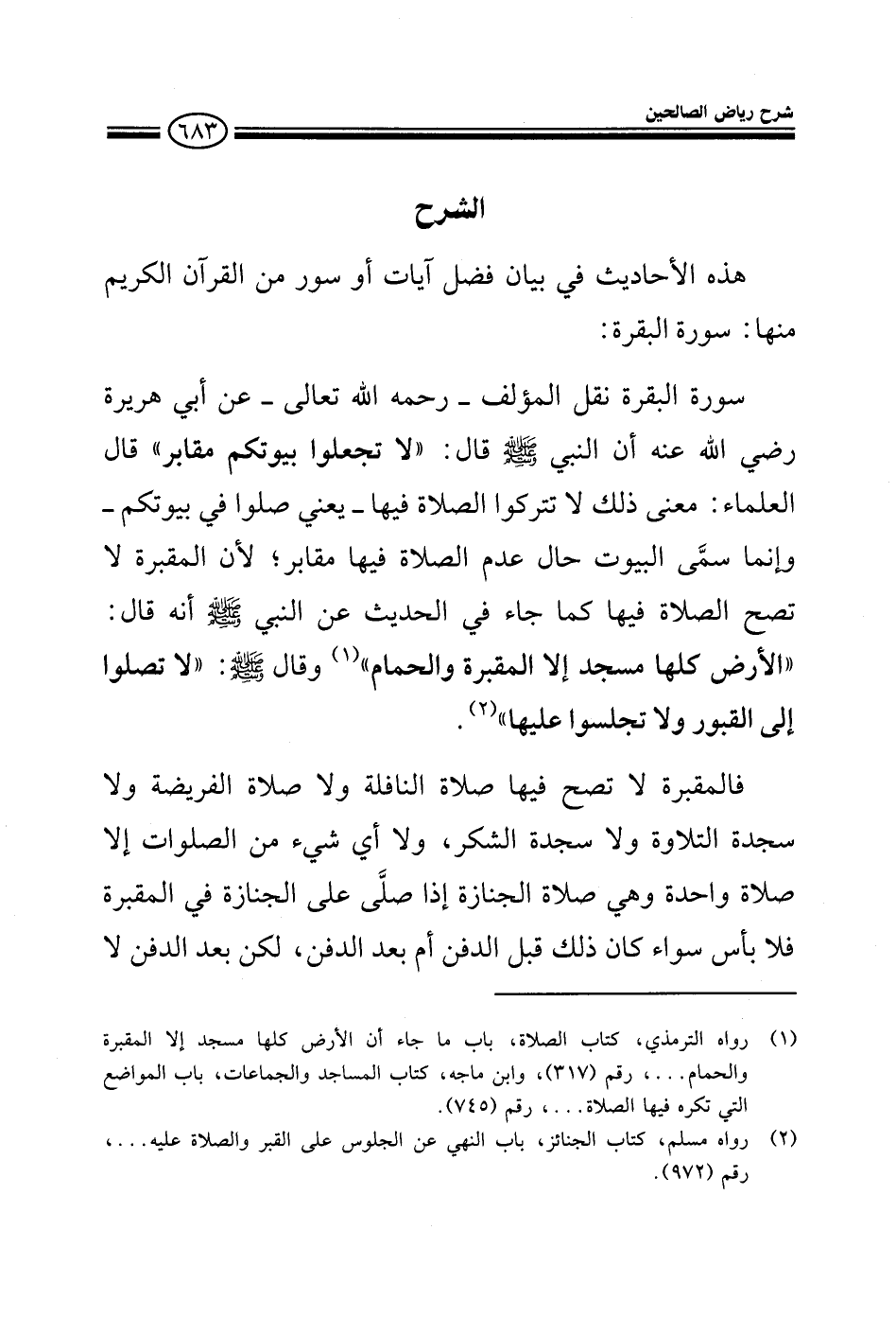 EXهذه الأحاديث في بيان فضل آيات أو سور من القرآن الكريم منها سورة البقرة نقل المؤلف رحمه الله عن أبي هريرة رضي الله عنه أن النبي صلى الله عليه وسلم قال لا تجعلوا بيوتكم مقابر قال العلماء معنى ذلك لا تتركوا الصلاة فيها يعني صلوا في بيوتكم وإنما سمى البيوت في حال عدم الصلاة فيها مقابر لأن المقبرة لا تصح الصلاة فيها كما جاء في الحديث عن النبي صلى الله عليه وسلم أنه قال الأرض كلها مسجد إلا المقبرة والحمام وقال لا تصلوا إلى القبور ولا تجلسوا عليها فالمقبرة لا تصح فيها صلاة النافلة ولا الفريضة ولا سجدة التلاوة ولا سجدة الشكر ولا أي شيء من الصلوات إلا صلاة واحدة وهي صلاة الجنازة إذا صلى على الجنازة في المقبرة فلا بأس سواء كان ذلك قبل الدفن أم بعده لكن بعد الدفن لا