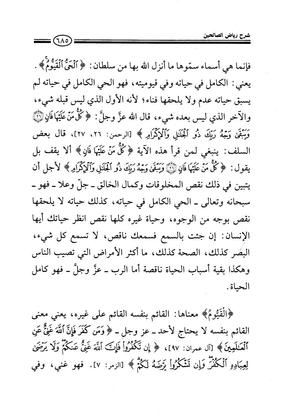 فإنما هي أسماء سموها ما أنزل الله بها من سلطان {الحي القيوم} يعني الكامل في حياته وفي قيوميته فهو الحي الكامل في حياته لم يسبق حياته عدم ولا يلحقها فناء لأنه الأول الذي ليس قبله شيء والآخر الذي ليس بعده شيء قال الله عز وجل {كل من عليها فان ويبقى وجه ربك ذو الجلال والإكرام} قال بعض السلف ينبغي لمن قرأ بهذه الآية {كل من عليها فان} ألا يقف بل يقول {كل من عليها فان ويبقى وجه ربك ذو الجلال والإكرام} .