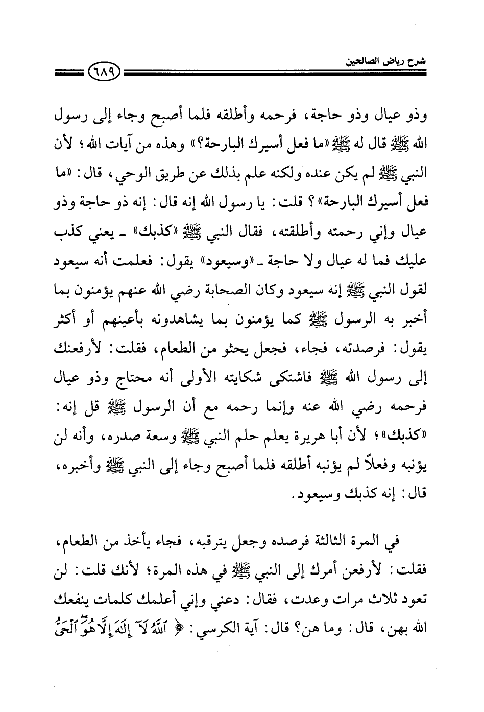 ذو عيال وذو حاجة فرحمه وأطلقه فلما أصبح وجاء إلى رسول الله صلى الله عليه وسلم قال له صلى الله عليه وسلم ما فعل أسيرك البارحة وهذه من آيات الله لأن النبي صلى الله عليه وسلم لم يكن عنده ولكنه علم بذلك عن طريق الوحي قال ما فعل أسيرك البارحة قلت يا رسول الله إنه قال إنه ذو حاجة وذو عيال فرحمته وأطلقته فقال النبي صلى الله عليه وسلم كذبك يعني كذب عليك وسيعود يقول فعلمت أنه سيعود لقول النبي صلى الله عليه وسلم إنه سيعود وكان الصحابة رضي الله عنهم يؤمنون بما أخبر به النبي صلى الله عليه وسلم كما يؤمنون بما يشاهدونه بأعينهم أو أكثر يقول فرصدته فجاء فجعل يحثو من الطعام فقلت لأرفعنك إلى رسول الله صلى الله عليه وسلم فاشتكى شكايته الأولى أنه محتاج وذو عيال فرحمه رضي الله عنه وإنما رحمه مع أن الرسول صلى الله عليه وسلم قال كذبك لأن أبا هريرة يعلم حلم النبي صلى الله عليه وسلم وسعة صدره وأنه لن يؤنبه وفعلا لم يؤنبه فلما أصبح وجاء إلى النبي صلى الله عليه وسلم وأخبره قال إنه كذبك وسيعود وفي المرة الثالثة جعل يترقبه وجاء يأكل من الطعام فقلت لأرفعن أمرك إلى النبي صلى الله عليه وسلم في هذه المرة لأنك قلت لن تعود ثلاث مرات وعدت فقال دعني وإني أعلمك كلمات ينفعك الله بهن قال وما هن قال آية الكرسي الله لا إله إلا هو الحي