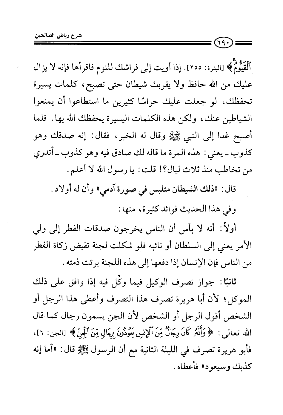 القيوم إذا أويت إلى فراشك للنوم فاقرأها فإنه لا يزال عليك من الله حافظ فلا يقربك شيطان حتى تصبح كلمات يسيرة تحفظك لو جعلت مائة حارس ما استطاعوا أن يمنعوا الشياطين عنك ولكن هذه كلمات يسيرة يحفظك الله بها فلما أصبح غدا إلى النبي صلى الله عليه وسلم وقال له الخبر فقال إنه صدقك وهو كذوب يعني هذه المرة ما قاله لك صادق فيه وهو كذوب أتدري من تخاطب منذ ثلاث ليال قلت يا رسول الله لا أعلم قال ذاك شيطان متلبس في صورة آدمي وفي هذا الحديث فوائد كثيرة