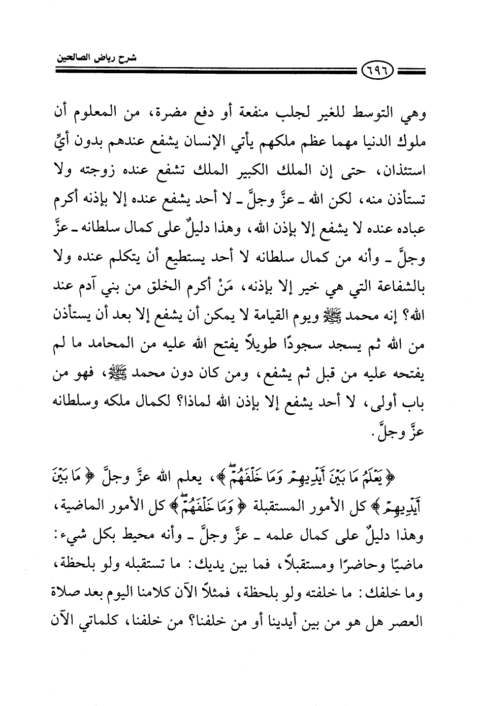 وهي التوسط للغير لجلب منفعة أو لدفع مضرة من المعلوم أن ملوك الدنيا مهما عظم ملكهم يشفع الإنسان عندهم بدون أي استئذان حتى إن الملك الكبير الملك تشفع عنده زوجته ولا تستأذن منه لكن الله عز وجل لا أحد يشفع عنده إلا بإذنه أكرم عباده عنده لا يشفع إلا بإذن الله وهذا دليل على كمال سلطانه عز وجل وأنه من كمال سلطانه لا أحد يستطيع أن يتكلم عنده ولا بالشفاعة التي هي خير إلا بإذنه من أكرم الخلق من بني آدم عند الله إنه محمد صلى الله عليه وسلم ويوم القيامة لا يمكن أن يشفع إلا بعد أن يستأذن من الله ثم يسجد سجودا طويلا يفتح الله عليه من المحامد ما لم يفتحه عليه من قبل ثم يشفع ومن دونه من باب أولى لا أحد يشفع إلا بإذن الله لماذا لكمال ملكه وسلطانه عز وجل {يعلم ما بين أيديهم وما خلفهم} يعلم الله عز وجل {ما بين أيديهم} كل الأمور المستقبلة {وما خلفهم} كل الأمور الماضية وهذا دليل على كمال علمه عز وجل وأنه محيط بكل شيء ماضيا وحاضرا ومستقبلا فما بين يديك ما تستقبله ولو بلحظة وما خلفك ما خلفته ولو بلحظة فمثلا كلامنا اليوم بعد صلاة العصر من بين أيدينا أم من خلفنا من خلفنا كلماتي الآن