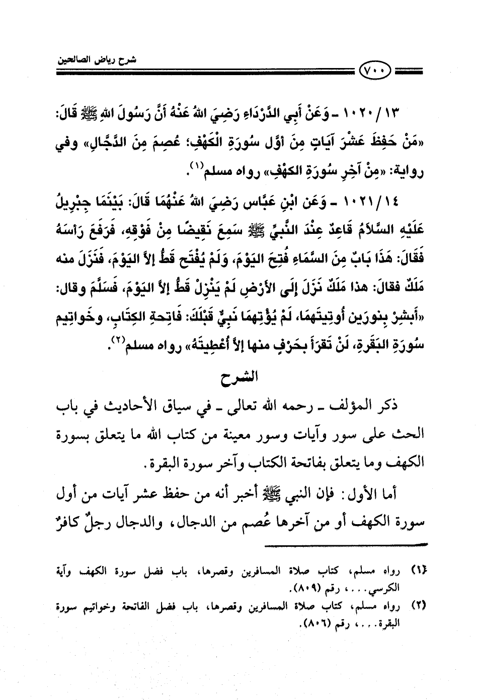 1021 - وعن أبي الدرداء رضي الله عنه أن رسول الله صلى الله عليه وسلم قال من حفظ عشر آيات من أول سورة الكهف عصم من الدجال وفي رواية من آخر سورة الكهف رواه مسلم.