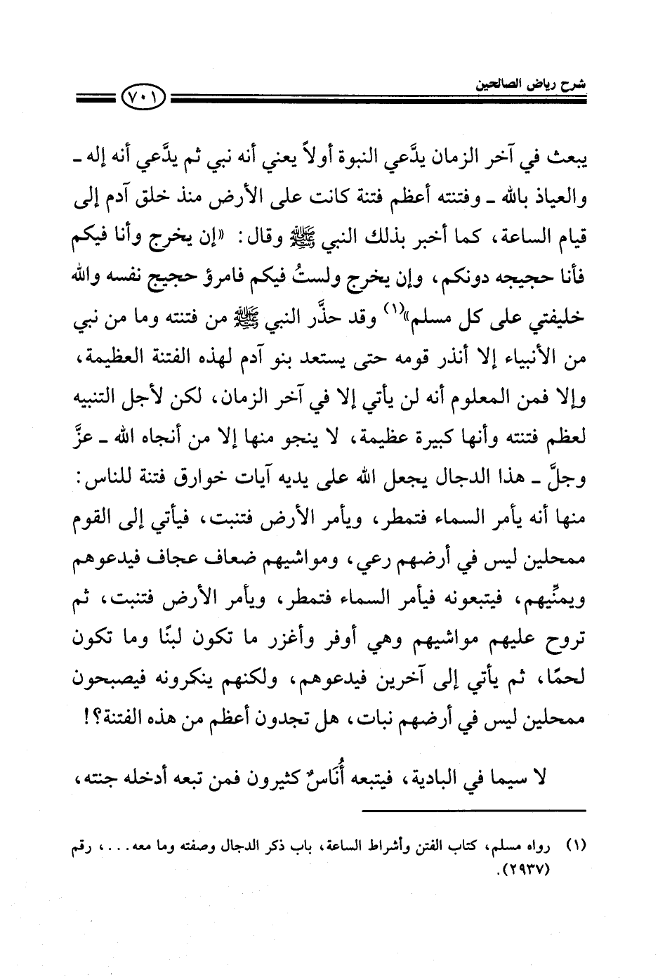 يبعث في آخر الزمان يدعي النبوة أولا ثم يدعي أنه إله والعياذ بالله وفتنته أعظم فتنة تكون على الأرض منذ خلق آدم إلى قيام الساعة كما أخبر بذلك النبي صلى الله عليه وسلم وقال إن خرج وأنا فيكم فأنا حجيجه دونكم وإلا فالله خليفتي على كل مسلم وقد حذر النبي صلى الله عليه وسلم من فتنته وما من نبي من الأنبياء إلا أنذر قومه حتى يستعد بنو آدم لهذه الفتنة العظيمة وإن كان من المعلوم أنه لا يأتي إلا في آخر الزمان لكن لأجل التنبيه لعظم فتنته وأنها كبيرة عظيمة لا ينجو منها إلا من أنجاه الله عز وجل هذا الدجال يجعل الله على يديه آيات خوارق فتنة للناس منها أنه يأمر السماء فتمطر ويأمر الأرض فتنبت فيأتي إلى القوم ليس في أرضهم رعي ومواشيهم ضعاف عجاف فيدعوهم ويمنيهم فيتبعونه فيأمر السماء فتمطر ويأمر الأرض فتنبت ثم تروح عليهم مواشيهم وهي أكثر ما تكون لبنا وأوفر ما تكون لحما ثم يأتي إلى آخرين فيدعوهم ولكنهم ينكرونه فيصبحون مقفرين ليس في أرضهم نبات هل تجدون أعظم من هذه الفتنة لاسيما في البادية فيتبعه أناس كثيرون فمن تبعه أدخله جنته