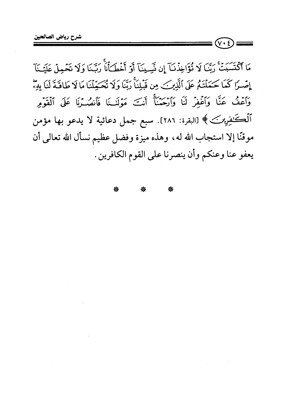 ما اكتسبت ربنا لا تؤاخذنا إن نسينا أو أخطأنا ربنا ولا تحمل علينا إصرا كما حملته على الذين من قبلنا ربنا ولا تحملنا ما لا طاقة لنا به واعف عنا واغفر لنا وارحمنا أنت مولانا فانصرنا على القوم الكافرين} سبع جمل دعائية ما يدعو بهن مؤمن موقنا مؤمنا إلا استجاب الله له وهذه ميزة وفضل عظيم نسأل الله تعالى أن يعفو عنا وعنكم وأن ينصرنا على القوم الكافرين.
