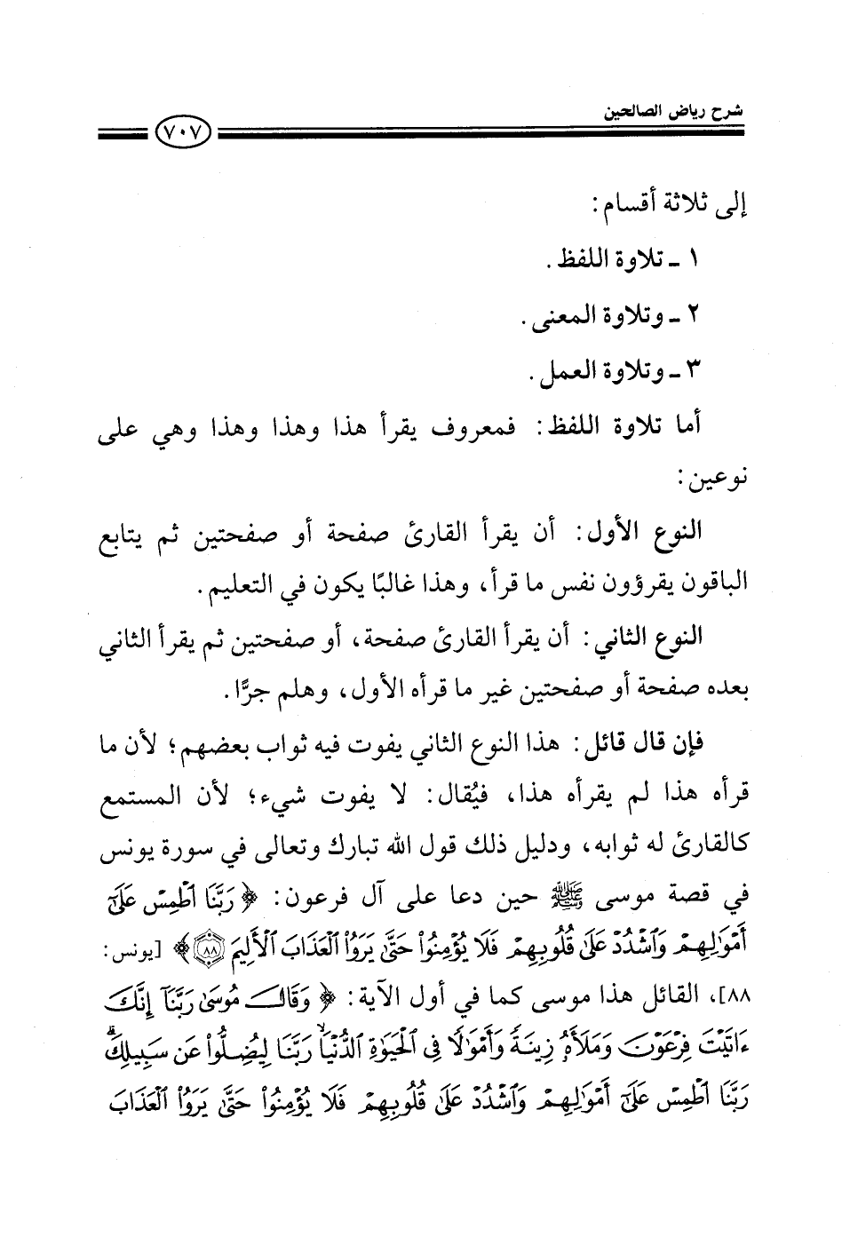 إلى ثلاثة أقسام: 1 - تلاوة اللفظ 2 - تلاوة المعنى 3 - تلاوة العمل أما تلاوة اللفظ فمعروف يقرأ هذا وهذا وهذا وهي على نوعين: 1 - أن يقرأ القارئ صفحة أو صفحتين ثم يتابع الباقون يقرءون نفس ما قرأ وهذا غالبا يكون في التعليم.