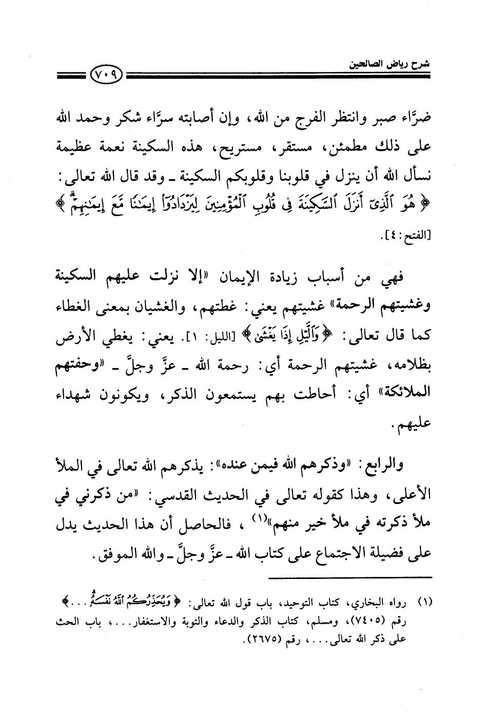 ضراء صبر وانتظر الأجر من الله وإن أصابته سراء شكر وحمد الله على ذلك مطمئن مستقر مستريح هذه السكينة نعمة عظيمة نسأل الله أن ينزل في قلوبنا وقلوبكم السكينة وقد قال الله تعالى {هو الذي أنزل السكينة في قلوب المؤمنين ليزدادوا إيمانا مع إيمانهم} فهي من أسباب زيادة الإيمان وغشيتهم الرحمة يعني غطتهم والغشيان بمعنى الغطاء كما قال تعالى {والليل إذا يغشى} يعني يغطي الأرض بظلامه & غشيتهم الرحمة أي رحمة الله عز وجل فتغشاهم وتحيط بهم وتكون لهم بمنزلة الغطاء الشامل لكل ما يحتاجون إليه من رحمة الله عز وجل وحفتهم الملائكة أحاطت بهم يستمعون الذكر ويكونون شهداء عليهم وذكرهم الله فيمن عنده يذكرهم الله تعالى في الملأ الأعلى وهذا كقوله تعالى في الحديث القدسي من ذكرني في ملأ ذكرته في ملأ خير منه وهذا الحديث يدل على فضيلة الاجتماع على كتاب الله عز وجل والله الموفق.