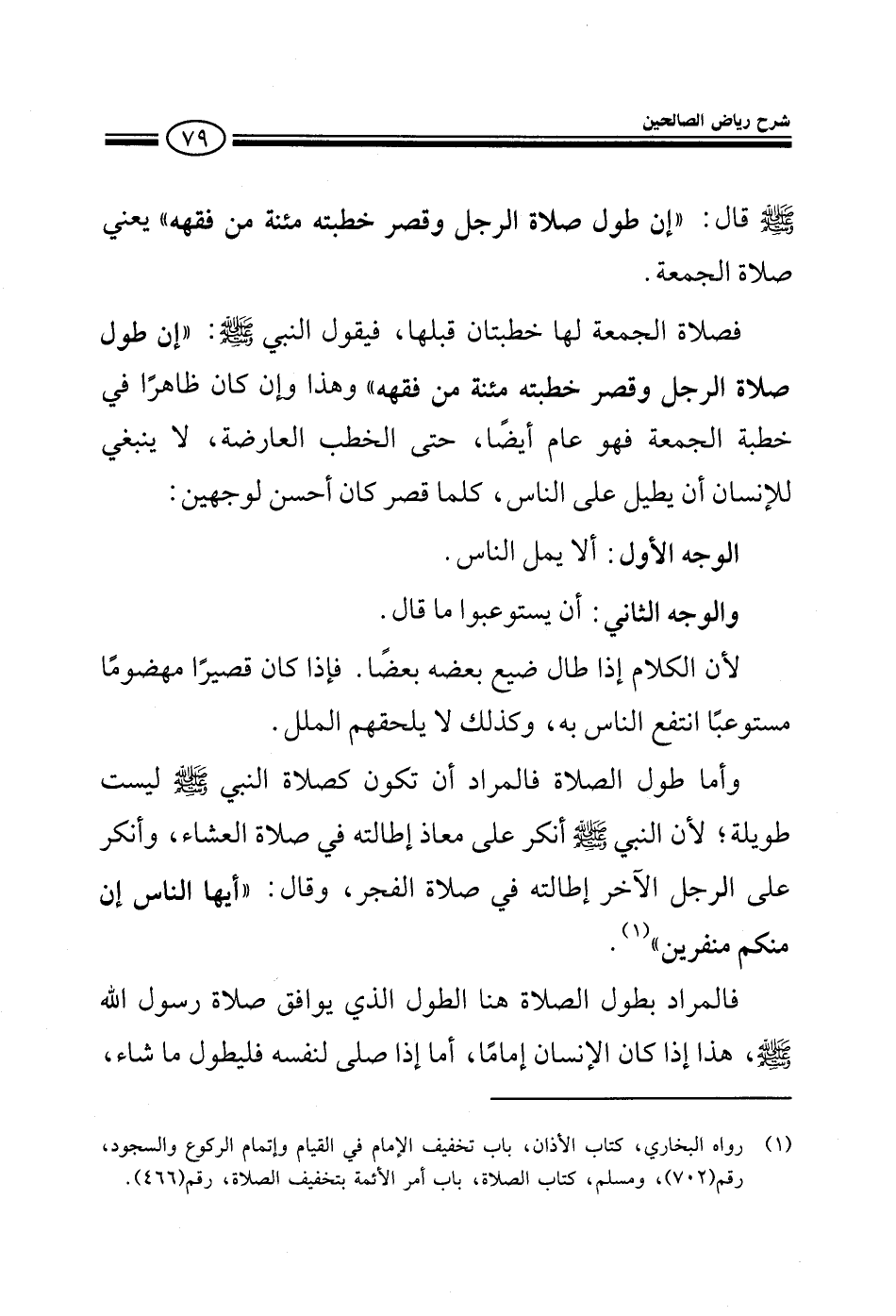 صلى الله عليه وسلم قال: إن طول صلاة الرجل وقصر خطبته مئنة من فقهه يعني: صلاة الجمعة فصلاة الجمعة لها خطبتان قبلها: فيقول النبي صلى الله عليه وسلم: وإن طول صلاة الرجل وقصر خطبته مئنة من فقهه وهذا وإن كان ظاهرا في خطبة الجمعة فهو عام أيضا حتى في الخطب العارضة لا ينبغي للإنسان أن يطيل على الناس كلما قصر كان أحسن لوجهين الوجه الأول: ألا يمل الناس الوجه الثاني: أن يستوعبوا ما قال لأن الكلام إذا طال ضيع بعضه بعضا فإذا كان قصيرا مهضوما مستوعبا انتفع به وكذلك لا يلحقهم الملل وأما طول الصلاة فالمراد أن تكون كصلاة النبي صلى الله عليه وسلم ليست طويلة لأن النبي صلى الله عليه وسلم أنكر على معاذ إطالته في صلاة العشاء وأنكر على الرجل الآخر إطالته في صلاة الفجر وقال: أيها الناس إن منكم منفرين فالمراد بطول الصلاة هنا الطول الموفق لصلاة رسول الله صلى الله عليه وسلم هذا إذا كان الإنسان إماما أما إذا صلى لنفسه فليطول ما شاء
