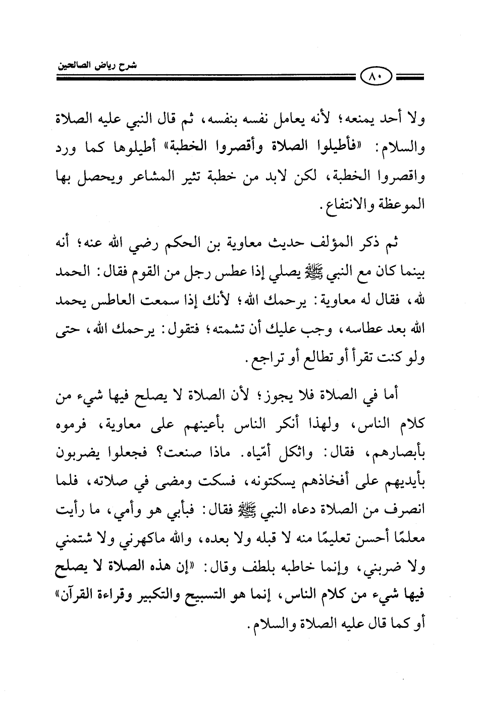 ثم ذكر المؤلف حديث معاوية بن الحكم رضي الله عنه أنه بينما كان مع النبي صلى الله عليه وسلم يصلي إذ عطس رجل من القوم فقال الحمد لله فقال له معاوية يرحمك الله لأنك إذا سمعت العاطس يحمد الله بعد عطاسه وجب عليك أن تشمته فتقول يرحمك الله حتى ولو كنت تقرأ أو تطالع أو تراجع أما في الصلاة فلا يجوز لأن الصلاة لا يصلح فيها شيء من كلام الناس ولهذا أنكر الناس بأعينهم على معاوية فرموه بأبصارهم فقال واثكل أمياه ماذا صنعت؟ فجعلوا يضربون بأيديهم على أفخاذهم يسكتونه فسكت ومضى في صلاته فلما انصرف من الصلاة دعاه النبي صلى الله عليه وسلم فقال فبأبي هو وأمي ما رأيت معلما أحسن تعليما منه لا قبله ولا بعده والله ما كهرني ولا ضربني ولا شتمني وإنما خاطبه بلطف وقال: إن هذه الصلاة لا يصلح فيها شيء من كلام الناس إنما هي التسبيح والتكبير وقراءة القرآن أو كما قال عليه الصلاة والسلام