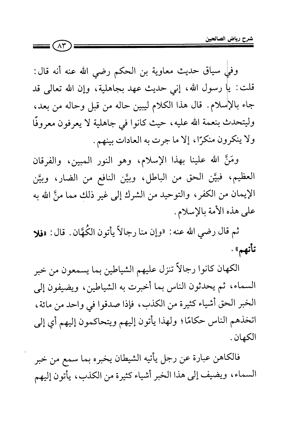 وفي سياق حديث معاوية بن الحكم رضي الله عنه أنه قال: قلت: يا رسول الله إني حديث عهد بجاهلية وإن الله تعالى قد جاء بالإسلام قال هذا الكلام ليبين حاله من قبل وحاله من بعد وليتحدث بنعمة الله عليه حيث كانوا في جاهلية لا يعرفون معروفا ولا ينكرون منكرا إلا ما جرت به العادات بينهم وجاءنا الله بهذا الإسلام بالنور المبين والفرقان العظيم فبين الحق من الباطل وبين النافع من الضار وبين الإيمان من الكفر والتوحيد من الشرك إلى غير ذلك مما من الله به على هذه الأمة بالإسلام ثم قال رضي الله عنه وإن منا رجالا يأتون الكهان قال فلا تأتهم الكهان كانوا رجالا تنزل عليهم شياطين الجن بما يسمعون من خبر السماء ثم يحدثون الناس بما أخبرت به الشياطين ويضيفون إلى الخبر الحق أشياء كثيرة من الكذب فإذا صدقوا في واحد من مائة اتخذهم الناس حكاما ولهذا يأتون إليهم ويتحاكمون إليهم فالكاهن عبارة عن رجل يأتيه الشيطان يخبره بما سمع من خبر السماء ويضيف إلى هذا الخبر أشياء كثيرة من الكذب يأتيهم