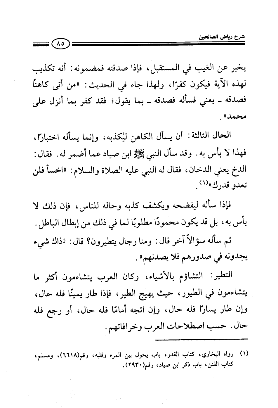 يخبر عن الغيب في المستقبل فإذا صدقته فمضمونه أنك تكذب هذه الآية فيكون ذلك كفرا الحالة الثالثة: أن يسأل الكاهن ليكذبه وإنما يسأله اختبارا فهذا لا بأس به وقد سأل النبي صلى الله عليه وسلم ابن صياد عما أضمر له فقال له: الدخ يعني: الدخان فقال له النبي عليه الصلاة والسلام اخسأ فلن تعدو قدرك فإذا سأله ليفضحه ويكشف كذبه وحاله للناس فإن هذا لا بأس به بل إن هذا يكون محمودا مطلوبا لما في ذلك من إبطال الباطل ثم سأل معاوية رضي الله عنه رسول الله صلى الله عليه وسلم سؤالا آخر قال ومنا رجال يتطيرون؟ قال: ذاك شيء يجدونه في صدورهم فلا يصدنهم والتطير: هو التشاؤم بالأشياء وكان العرب يتشاءمون أكثر ما يتشاءمون في الطيور فإذا طار يمينا فله حال وإن طار يسارا فله حال وإن اتجه أماما فله حال أو رجع فله حال حسب اصطلاحات العرب وخرافاتهم