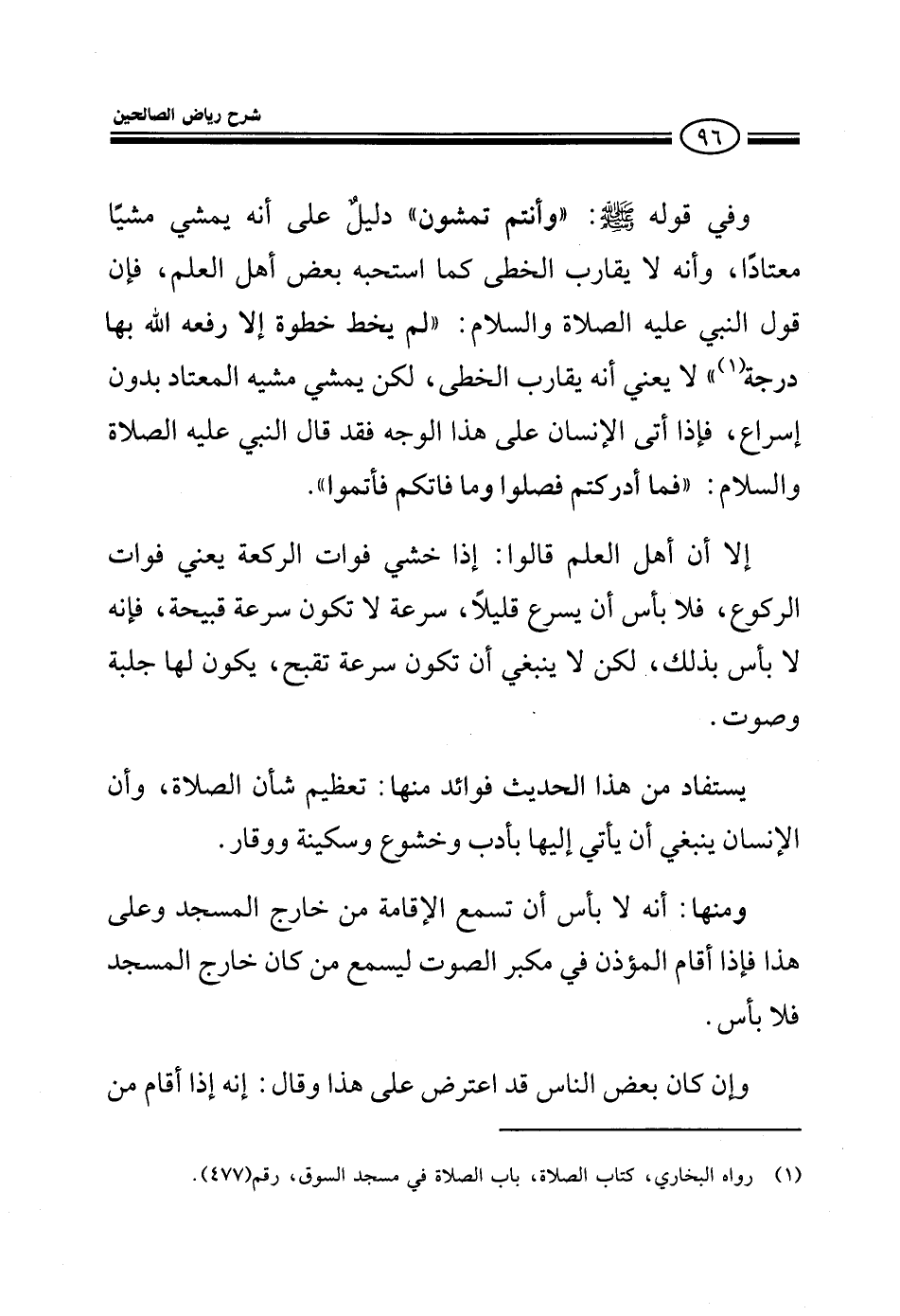 وفي قوله صلى الله عليه وسلم: وأنتم تمشون دليل على أنه يمشي مشيا معتادا وأنه لا يقارب الخطى كما استحبه بعض أهل العلم وأما قول النبي عليه الصلاة والسلام: لم يخط خطوة إلا رفع الله بها درجة يعني أنه يقارب الخطي لكن يمشي مشية المعتاد بدون إسراع فإذا أتى الإنسان على هذا الوجه فقد قال النبي عليه الصلاة والسلام: فما أدركتم فصلوا وما فاتكم فأتموا إلا أن أهل العلم قالوا إذا خشي فوات الركعة يعني فوات الركوع فلا باس أن يسرع قليلا سرعة لا تكون سرعة قبيحة فإنه لا بأس بذلك لا ينبغي أن تكون سرعة تقبح يكون لها جلبة وصوت يستفاد من هذا الحديث فوائد منها تعظيم شأن الصلاة وأن الإنسان ينبغي أن يأتي إليها بأدب وخشوع وسكينة ووقار ومنها: أنه لا بأس أن تسمع الإقامة من خارج المسجد وعلى هذا فإذا أقام المؤذن في مكبر الصوت ليسمع من كان خارج المسجد فلا بأس وإن كان بعض الناس قد اعترض على هذا إذا وقال إنه إذا أقام من