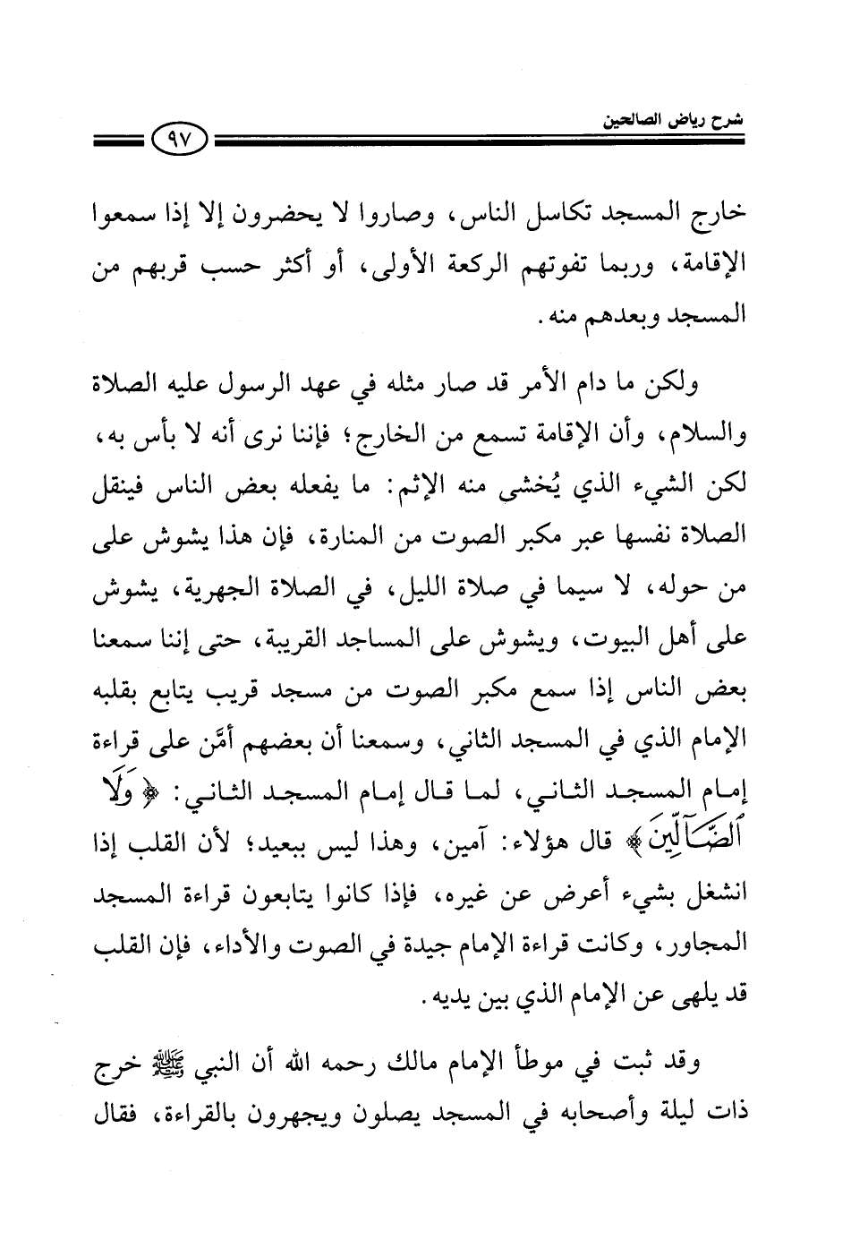 خارج المسجد تكاسل الناس وصاروا لا يحضرون إلا إذا سمعوا الإقامة وربما تفوتهم الركعة الأولى أو يفوتهم أكثر حسب قربهم من المسجد أو بعدهم منه ولكن ما دام قد حدث مثله في عهد الرسول عليه الصلاة والسلام وأن الإقامة كانت تسمع من الخارج فإننا نرى أنه لا بأس بذلك لكن الشيء الذي يخشى منه الإثم ما يفعله بعض الناس فينقل الصلاة نفسها عبر مكبر الصوت من المنارة فإن هذا يشوش على من حوله لاسيما في صلاة الليل الجهرية يشوش على أصل البيوت ويشوش على المساجد القريبة حتى إننا سمعنا بعض الناس إذا سمع مكبر الصوت من مسجد قريب وكان الإمام حسن الصوت والقراءة صار المأموم الذي في هذا المسجد يتابع بقلبه الإمام في المسجد الثاني حتى سمعنا أن بعضهم أمن على قراءة إمام المسجد الثاني لما قال إمام المسجد الثاني {ولا الضالين} قال هؤلاء: آمين وهذا ليس ببعيد لأن القلب إذا انشغل بشيء أعرض عن غيره فإذا كانوا يتابعون قراءة المسجد المجاور وكانت قراءة الإمام جيدة في الصوت والأداء فإن القلب قد يلهى عن الإمام الذي بين يديه وقد ثبت في موطأ الإمام مالك رحمه الله أن النبي صلى الله عليه وسلم خرج ذات ليلة وأصحابه في المسجد يصلون وقد علت أصواتهم بالقراءة فقال