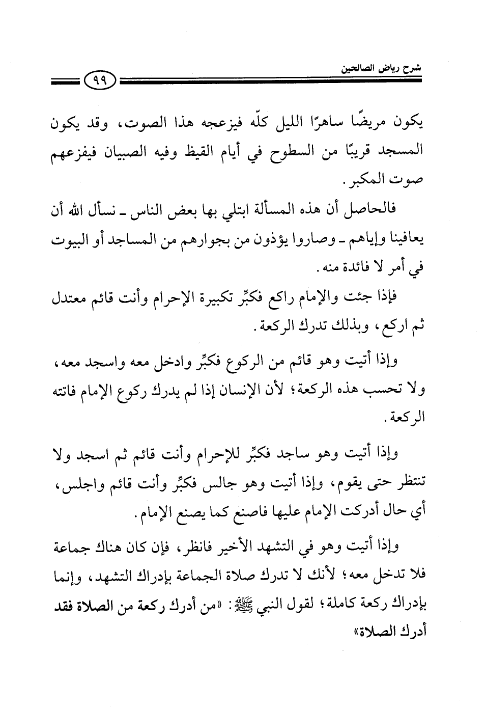 يكون مريضا فيزعجه هذا الصوت وقد يكون المسجد قريبا من السطوح في أيام القيظ وفيه الصبيان فيفزعهم صوت المكبر فالحاصل أن هذه المسالة ابتلى بها بعض الناس نسأل الله أن يعافينا وصاروا يؤذون من بجوارهم من المساجد أو البيوت في أمر لا فائدة منه ومعنى قوله صلى الله عليه وسلم: فما أدركتم فصلوا وما فاتكم فأتموا أن الإنسان يكبر تكبيرة الإحرام ثم يدخل مع الإمام على الحال التي فيها فإذا جئت والإمام راكع فكبر تكبيرة الإحرام وأنت معتدل ثم اركع وبذلك تدرك الركعة وإذا أتيت وهو قائم من الركوع فكبر وادخل معه واسجد معه ولا تحسب هذه الركعة لأن الإنسان إذا لم يدرك ركوع الإمام فاتته الركعة وإذا أتيت وهو ساجد فكبر للإحرام وأنت قائم ثم اسجد ولا تنتظر حتى يقوم وإذا أتيت وهو جالس فكبر وأنت قائم واجلس أي حال أدركت الإمام عليها فاصنع كما يصنع الإمام وإذا أتيت وهو في التشهد الأخير نظرت إن كان معك جماعة في مثل حالك فلا تدخل معه لأنك لا تدرك صلاة الجماعة بإدراك التشهد لا تدرك الجماعة إلا إذا أدركت ركعة كاملة لقول النبي صلى الله عليه وسلم: من أدرك ركعة من الصلاة فقد أدرك الصلاة