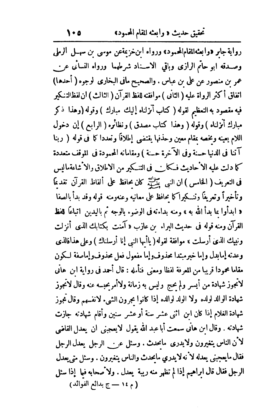 الخامس: أن النبي صلى الله عليه وسلم كان يحافظ على ألفاظ القرآن تقديما وتأخيرا وتعريفا وتنكيرا كما يحافظ على معانيه وعنه ومنه قوله وقد بدأ بالصفا "أبدأ بما بدأ الله به" تقدم تخريجه ومنه بداءته في الوضوء بالوجه ثم اليدين باتباعا للفظ القرآن ومنه قوله في حديث البراء ابن عازب: "آمنت بكتابك الذي أنزلت ونبيك الذي أرسلت " موافقة لقوله: {يَا أَيُّهَا النَّبِيُّ إِنَّا أَرْسَلْنَاكَ} وعلى هذا فالذي وعدته إما بدل وإما خبر مبتدأ محذوف وإما مفعول فعل محذوف وإما صفة لكون مقاما محمودا قريبا من المعرفة لفظا ومعنى فتأمله.