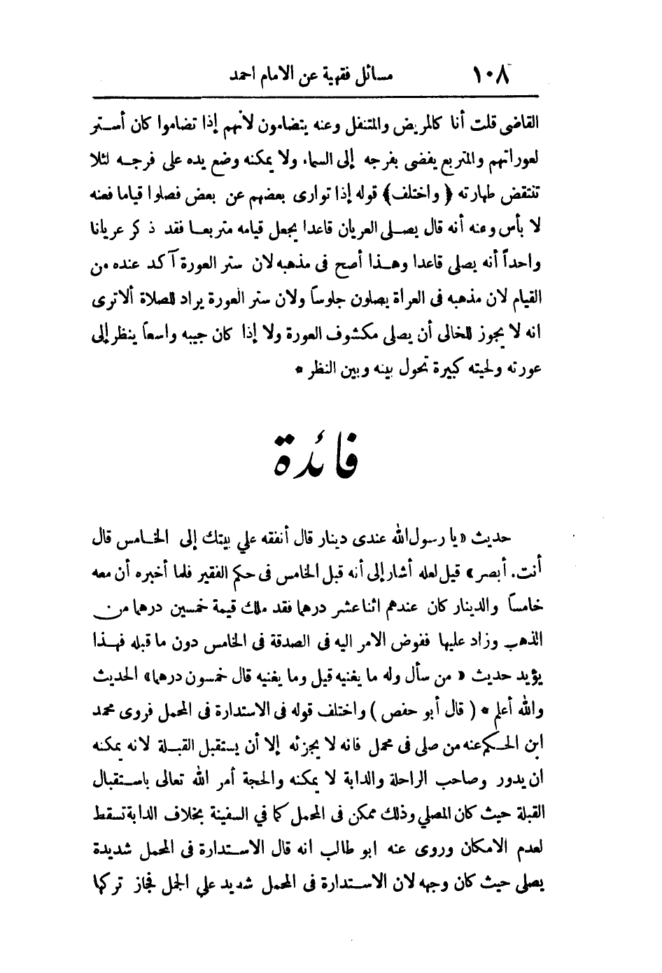 قال أبو حفص: "واختلف قوله في الاستدارة في المحمل فروى محمد بن الحكم عنه من صلى في محمل فإنه لا يجزئه إلا أن يستقبل القبلة لأنه يمكنه أن يدور وصاحب الراحلة والدابة لا يمكنه والحجة أمر الله تعالى باستقبال القبلة حيث كان المصلى وذلك ممكن في المحمل كما في السفينة بخلاف الدابة تسقط لعدم الإمكان وروى عنه أبو طالب أنه قال: "الاستدارة في المحمل شديدة يصلي حيث كان وجهه لأن الاستدارة في المحمل شديدة على الجمل فجاز تركها