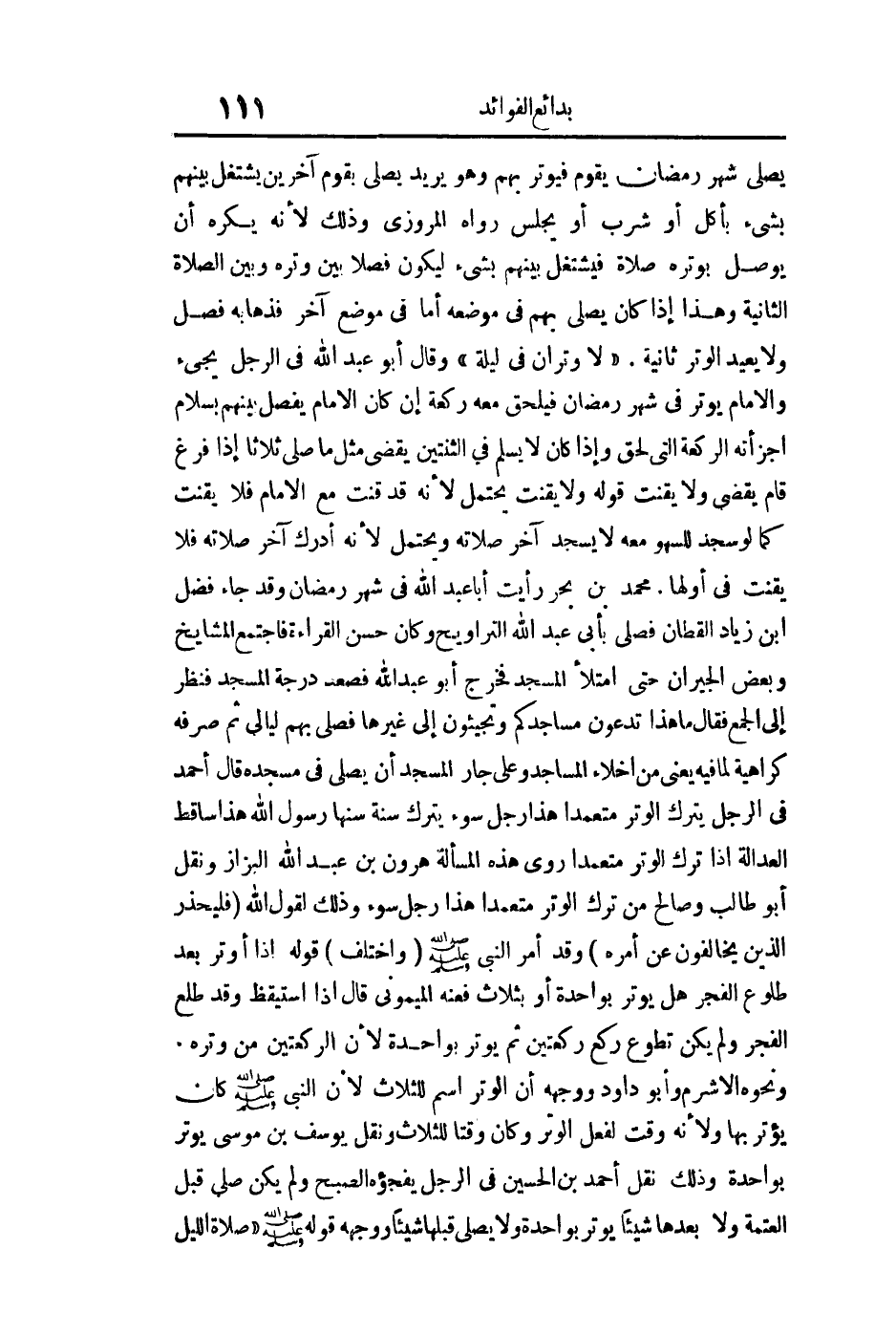 قال أحمد رضي الله عنه في الرجل يترك الوتر متعمدا: "هذا رجل سوء يترك سنة سنها رسول الله صلى الله عليه وسلم هذا ساقط العدالة إذا ترك الوتر متعمدا" روى هذا المسألة هارون بن عبد الله البزاز ونقل أبو طالب وصالح "من ترك الوتر متعمدا هذا رجل سوء وذلك لقول الله تعالى: {فَلْيَحْذَرِ الَّذِينَ يُخَالِفُونَ عَنْ أَمْرِهِ} وقد أمر النبي صلى الله عليه وسلم.