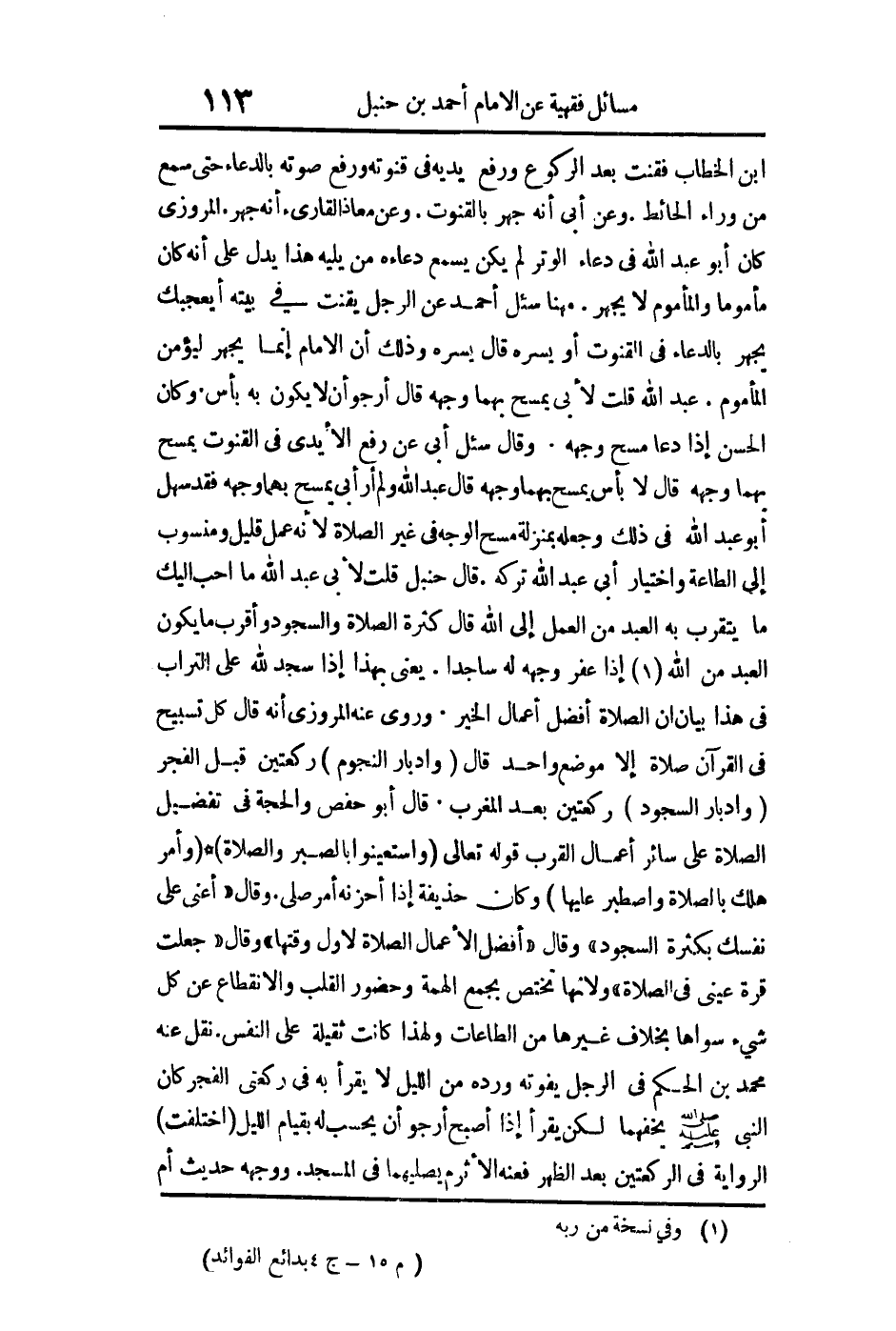 قال عبد الله: "ولم أر أبي يمسح بهما وجهه فقد سهل أبو عبد الله في ذلك وجعله بمنزلة مسح الوجه في غير الصلاة لأنه عمل قليل ومنسوب إلى الطاعة واختيار أبي عبد الله تركه" قال حنبل: قلت لأبي عبد الله ما أحب إليك ما يتقرب به العبد من العمل إلى الله؟ قال: "كثرة الصلاة والسجود وأقرب ما يكون العبد من الله إذا عفر وجهه له ساجدا". يعنى بهذا إذا سجد لله على التراب في هذا بيان أن الصلاة أفضل أعمال الخير وروى عنه المروزي أنه قال: "كل تسبيح في القرآن صلاة إلا موضع واحد قال: {وَإِدْبَارَ النُّجُومِ} ركعتين قبل الفجر {وَأَدْبَارَ السُّجُودِ} ركعتين بعد المغرب.