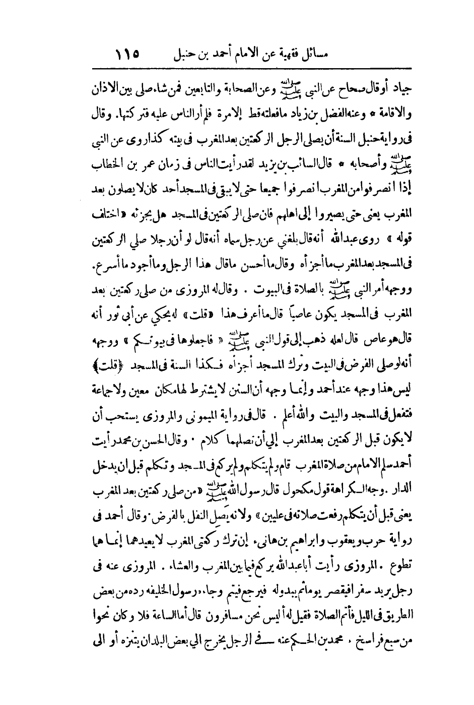 المروزي رأيت أبا عبد الله يركع فيما بين المغرب والعشاء. المروزي عنه في رجل يريد سفرا فيقصر يوما ثم يبدو له فيرجع فيتم وجاءه رسول الخليفة رده من بعض الطريق في الليل فأتم الصلاة فقيل له أليس نحن مسافرون قال: "أما الساعة فلا" وكان نحوا من سبع فراسخ محمد بن الحكم عنه في الرجل يخرج إلى بعض البلدان يتنزه أو إلى