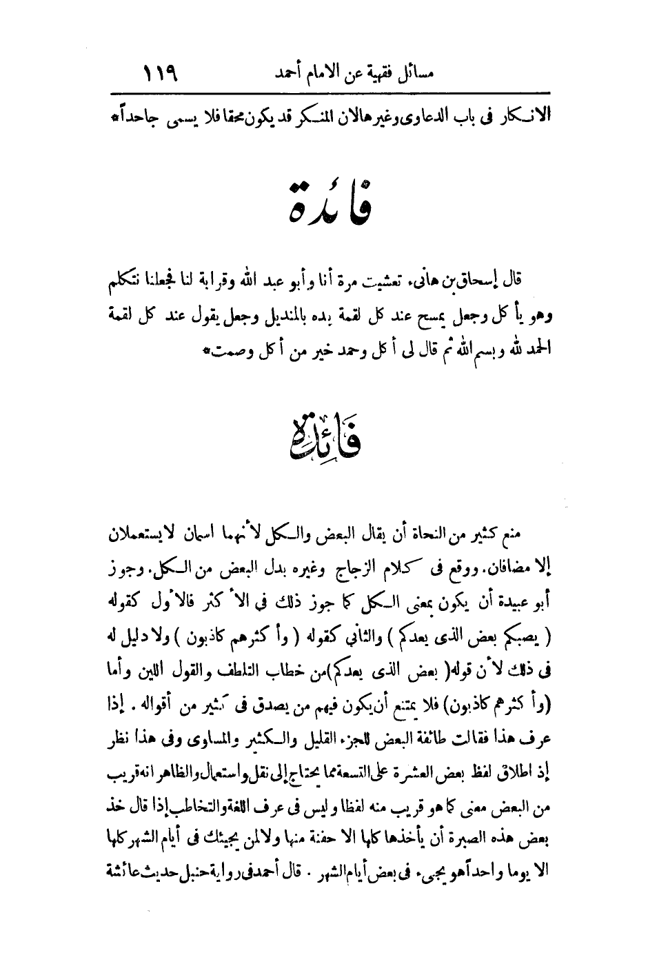 إذا عرف هذا فقالت طائفة البعض للجزء القليل والكثير والمساوي وفي هذا نظر إذ إطلاق لفظ بعض العشرة على التسعة مما يحتاج إلى نقل واستعمال والظاهر أنه قريب من البعض معنى كما هو قريب منه لفظا وليس في عرف اللغة والتخاطب إذا قال خذ بعض هذه الصبرة أن يأخذها كلها إلا حفنة منها ولا لمن يجيئك في أيام الشهر كلها إلا يوما واحدا هو يجيء في بعض أيام الشهر مسائل فقهية عن الإمام أحمد قال أحمد في رواية حنبل حديث عائشة