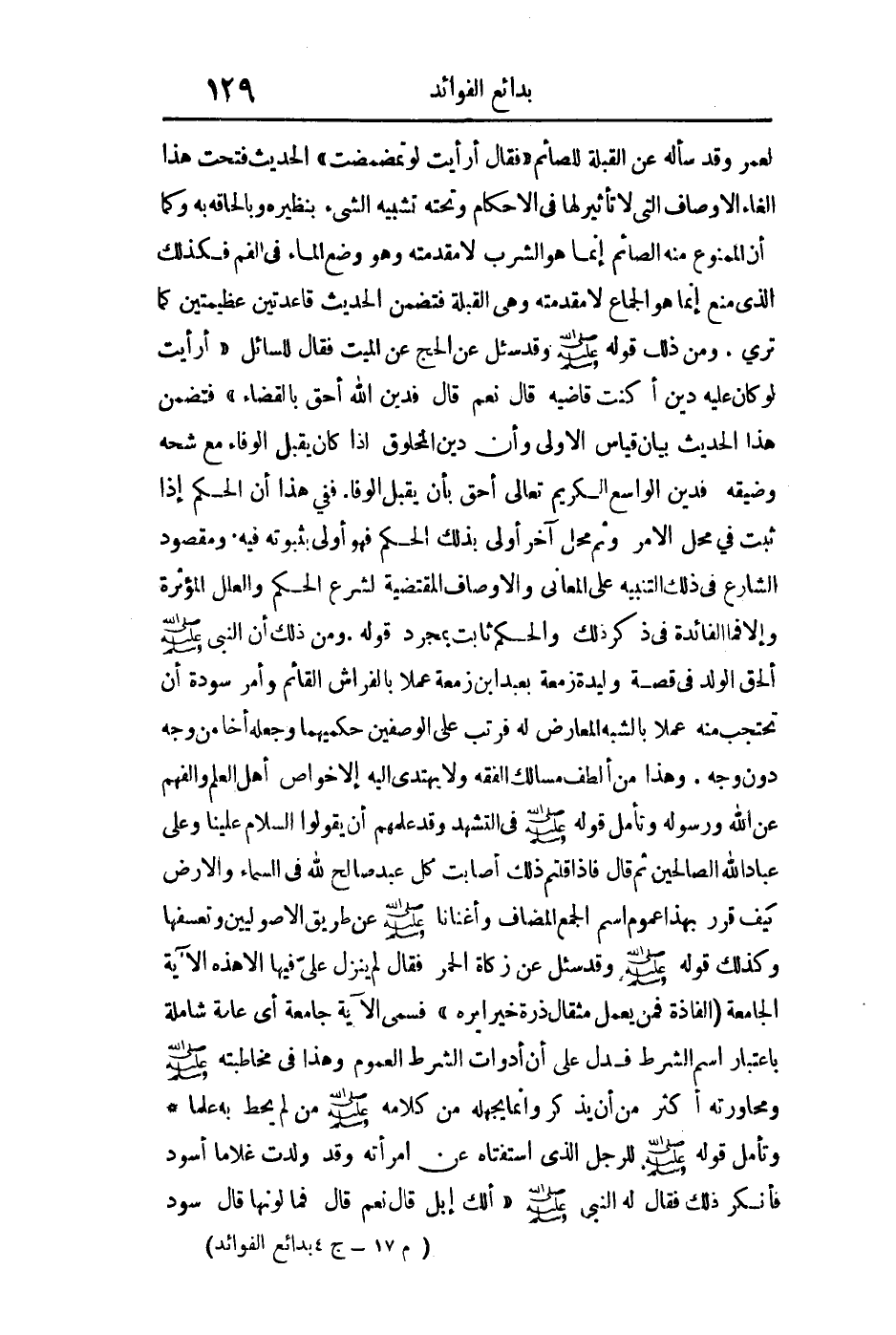 ومن ذلك قوله وقد سئل عن الحج عن الميت فقال للسائل: "أرأيت لو كان عليه دين أكنت قاضية قال: نعم قال: فدين الله أحق بالقضاء" فتضمن هذا الحديث بيان قياس الأولى وأن دين المخلوق إذا كان يقبل الوفاء مع شحه وضيقه فدين الواسع الكريم تعالى أحق بأن يقبل الوفاء ففي هذا أن الحكم إذا ثبت في محل الأمر وثم محل آخر أولى بذلك الحكم فهو أولى بثبوته فيه ومقصود الشارع في ذلك التنبيه على المعاني والأوصاف المقتضية لشرع الحكم والعلل المؤثرة وإلا فما الفائدة في ذكر ذلك والحكم ثابت بمجرد قوله.