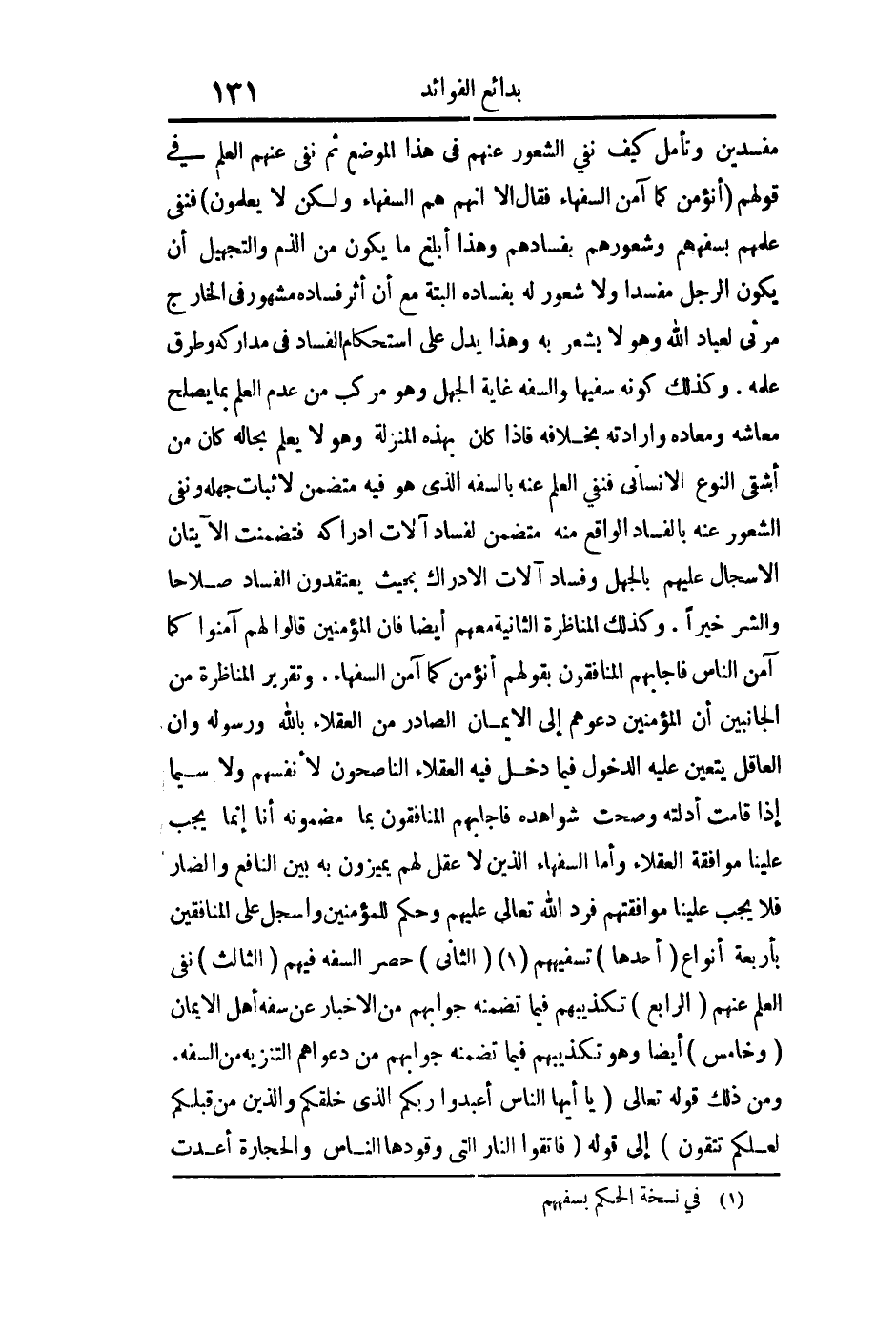 وتأمل كيف نفى الشعور عنهم في هذا الموضع ثم نفى العلم في قولهم: {أَنُؤْمِنُ كَمَا آمَنَ السُّفَهَاءُ} فقال: {أَلا إِنَّهُمْ هُمُ السُّفَهَاءُ وَلَكِنْ لا يَعْلَمُونَ} فنفى علمهم بسفههم وشعورهم بفسادهم وهذا أبلغ ما يكون من الذم والتجهيل أن يكون الرجل مفسدا ولا شعور له بفساده البتة مع أن أثر فساده مشهور في الخارج مرئي لعباد الله وهو لا يشعر به وهذا يدل على استحكام الفساد في مداركه وطرق علمه وكذلك كونه سفيها والسفه غاية الجهل وهو مركب من عدم العلم بما يصلح معاشه ومعاده وإرادته بخلافه فإذا كان بهذه المنزلة وهو لا يعلم بحاله كان من أشقى النوع الإنساني فنفي العلم عنه بالسفه الذي هو فيه متضمن لإثبات جهله ونفى الشعور عنه بالفساد الواقع منه متضمن لفساد آلات إدراكه فتضمنت الآيتان الإسجال عليهم بالجهل وفساد آلات الإدراك بحيث يعتقدون الفساد صلاحا والشر خيرا.