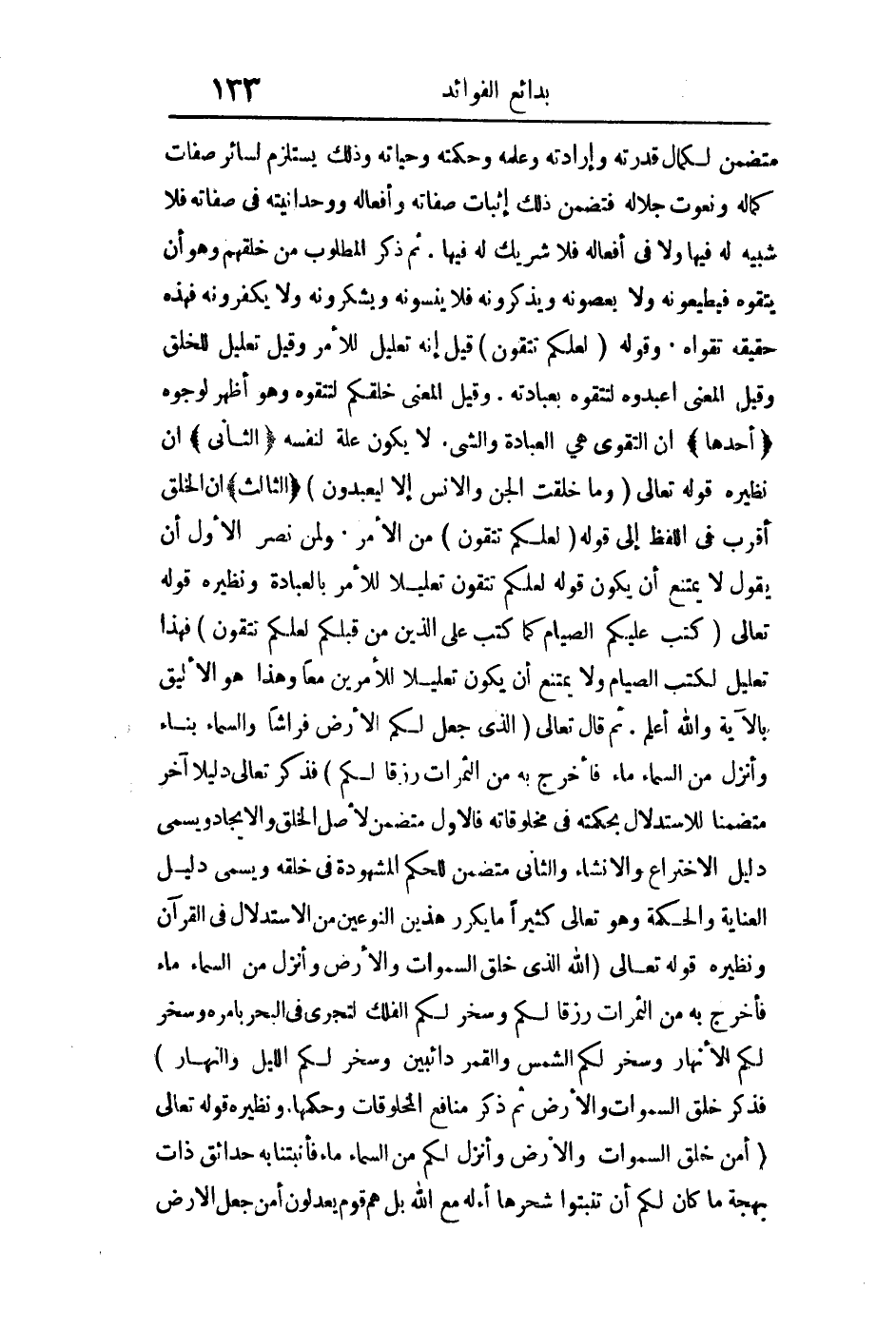 ولمن نصر الأول أن يقول لا يمتنع أن يكون قوله لعلكم تتقون تعليلا للأمر بالعبادة ونظيره قوله تعالى: {كُتِبَ عَلَيْكُمُ الصِّيَامُ كَمَا كُتِبَ عَلَى الَّذِينَ مِنْ قَبْلِكُمْ لَعَلَّكُمْ تَتَّقُونَ} فهذا تعليل لكتب الصيام ولا يمتنع أن يكون تعليلا للأمرين معا وهذا هو الأليق بالآية والله أعلم. ثم قال تعالى: {الَّذِي جَعَلَ لَكُمُ الأرْضَ فِرَاشاً وَالسَّمَاءَ بِنَاءً وَأَنْزَلَ مِنَ السَّمَاءِ مَاءً فَأَخْرَجَ بِهِ مِنَ الثَّمَرَاتِ رِزْقاً لَكُمْ} فذكر تعالى دليلا آخر متضمنا للاستدلال بحكمته في مخلوقاته فالأول متضمن لأصل الخلق والإيجاد ويسمى دليل الاختراع والإنشاء والثاني متضمن للحكم المشهودة في خلقه ويسمى دليل العناية والحكمة وهو تعالى كثيرا ما يكرر هذين النوعين من الاستدلال في القرآن ونظيره قوله تعالى: {اللَّهُ الَّذِي خَلَقَ السَّمَاوَاتِ وَالأرْضَ وَأَنْزَلَ مِنَ السَّمَاءِ مَاءً فَأَخْرَجَ بِهِ مِنَ الثَّمَرَاتِ رِزْقاً لَكُمْ وَسَخَّرَ لَكُمُ الْفُلْكَ لِتَجْرِيَ فِي الْبَحْرِ بِأَمْرِهِ وَسَخَّرَ لَكُمُ الأنْهَارَ وَسَخَّرَ لَكُمُ الشَّمْسَ وَالْقَمَرَ دَائِبَيْنِ وَسَخَّرَ لَكُمُ اللَّيْلَ وَالنَّهَارَ} فذكر خلق السموات والأرض ثم ذكر منافع المخلوقات وحكمها ونظيره قوله تعالى: {أَمَّنْ خَلَقَ السَّمَاوَاتِ وَالأرْضَ وَأَنْزَلَ لَكُمْ مِنَ السَّمَاءِ مَاءً فَأَنْبَتْنَا بِهِ حَدَائِقَ ذَاتَ بَهْجَةٍ مَا كَانَ لَكُمْ أَنْ تُنْبِتُوا شَجَرَهَا أَإِلَهٌ مَعَ اللَّهِ بَلْ هُمْ قَوْمٌ يَعْدِلُونَ أَمَّنْ جَعَلَ الأرْضَ