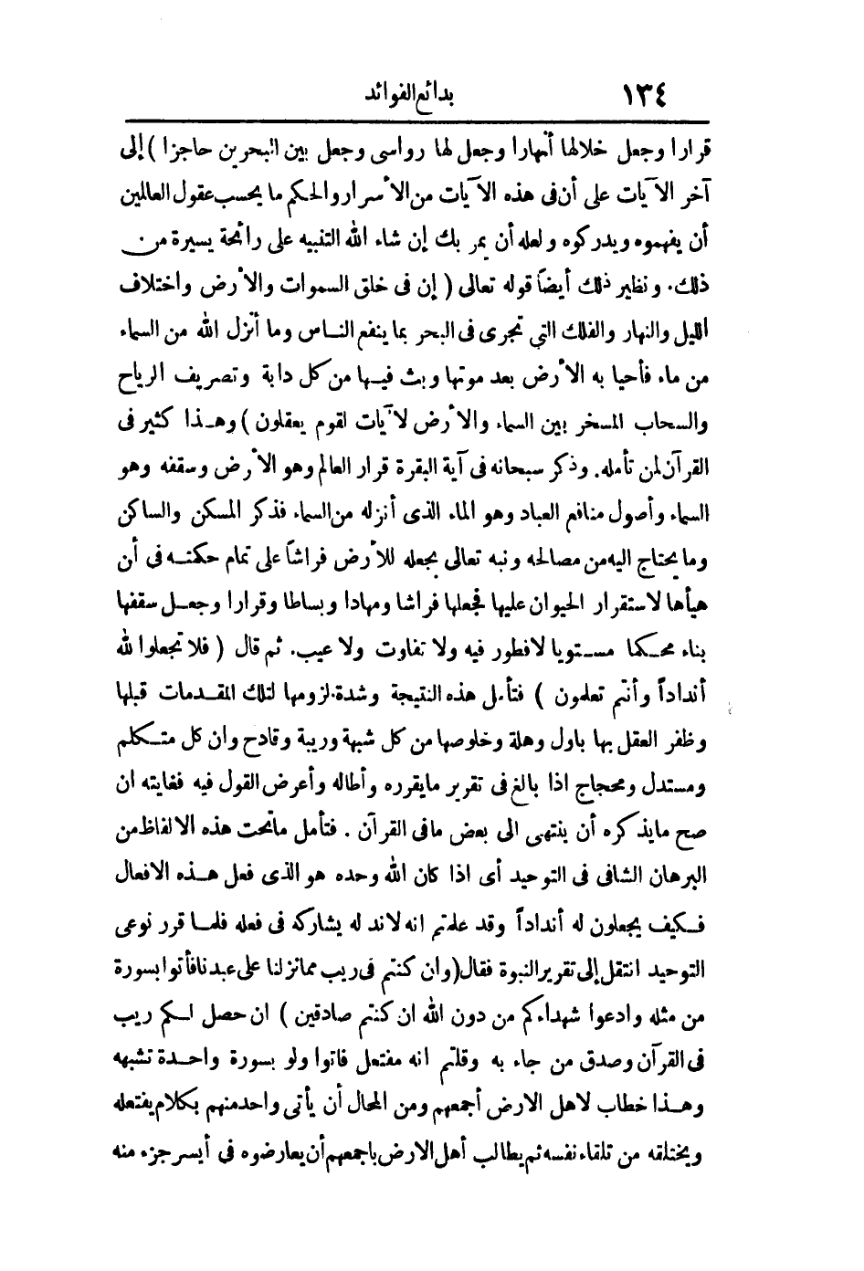 وذكر سبحانه في سورة البقرة قرار العالم وهو الأرض وسقفه وهو السماء وأصول منافع العباد وهو الماء الذي انزله من السماء فذكر المسكن والساكن وما يحتاج إليه من مصالحه ونبه تعالى بجعله للأرض فراشا على تمام حكمته في أن هيأها لاستقرار الحيوان عليها فجعلها فراشا ومهادا وبساطا وقرارا وجعل سقفها بناء محكما مستويا لا فطور فيه ولا تفاوت ولا عيب ثم قال: {فَلا تَجْعَلُوا لِلَّهِ أَنْدَاداً وَأَنْتُمْ تَعْلَمُونَ} فتأمل هذه النتيجة وشدة لزومها لتلك المقدمات قبلها وظفر العقل بها بأول وهلة وخلوصها من كل شبهة وريبة وقادح وإن كل متكلم ومستدل ومحاج إذا بالغ في تقرير ما يقرره وأطاله وأعرض القول فيه فغايته إن صح ما يذكره أن ينتهي إلي بعض ما في القرآن فتأمل ما تحت هذه الألفاظ من البرهان الشافي في التوحيد أي إذا كان الله وحده هو الذي فعل هذه الأفعال فكيف يجعلون له أندادا وقد علمتم أنه لا ند له يشاركه في فعله إعجاز القرآن في بلاغته.