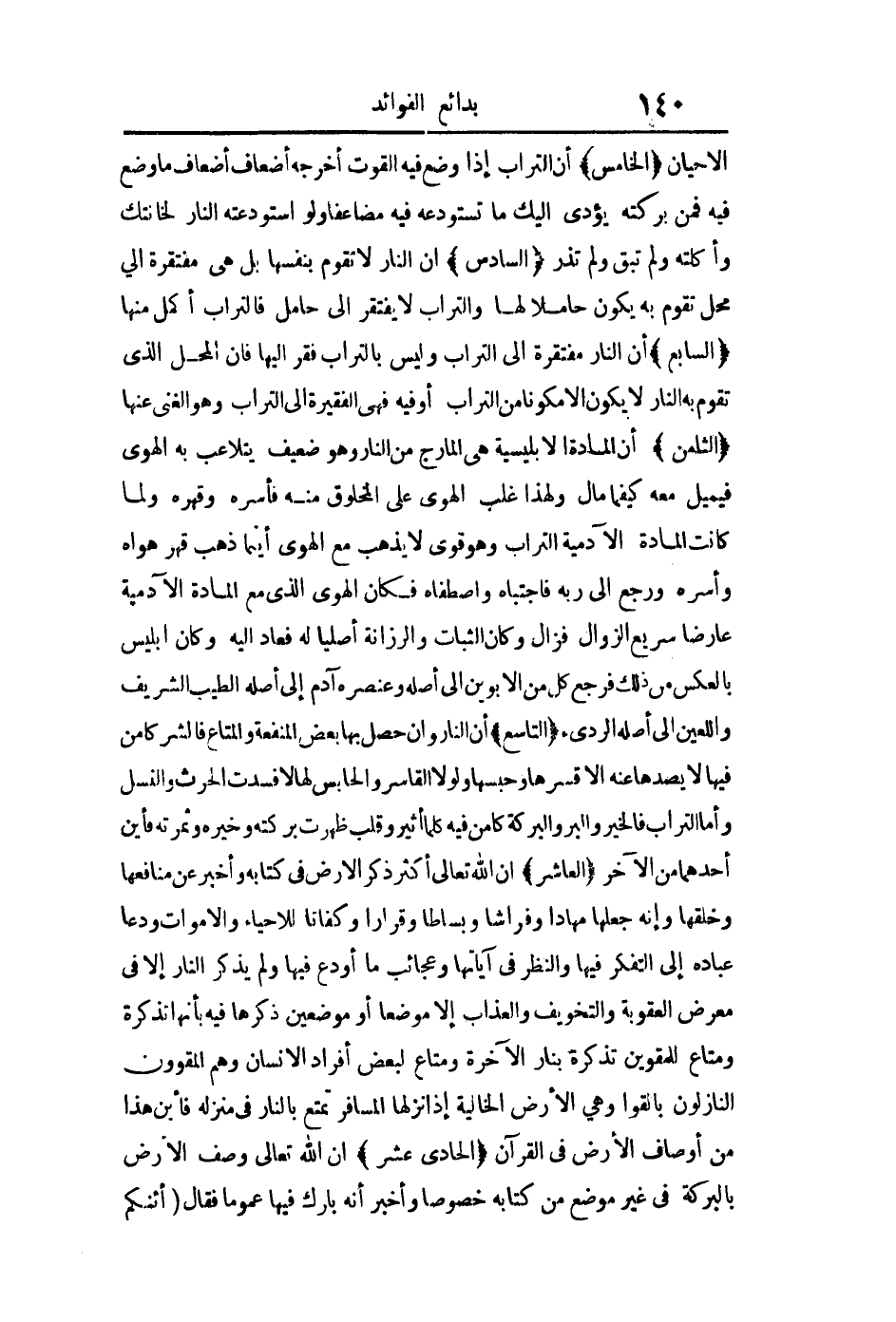 التاسع: أن النار وإن حصل بها بعض المنفعة والمتاع فالشر فيها لا يصدها عنه إلا قسرها وحبسها ولولا القاسر والحابس لها لأفسدت الحرث والنسل وأما التراب فالخير والبر والبركة كامن فيه كلما أثير وقلب ظهرت بركته وخيره وثمرته فأين أحدهما من الآخر.