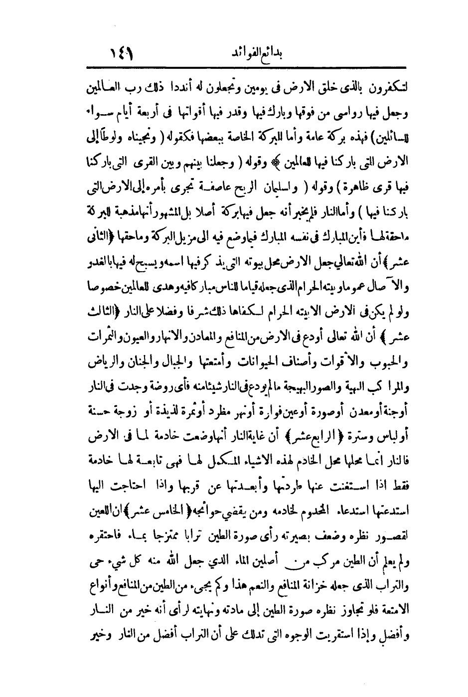 لَتَكْفُرُونَ بِالَّذِي خَلَقَ الأرْضَ فِي يَوْمَيْنِ وَتَجْعَلُونَ لَهُ أَنْدَاداً ذَلِكَ رَبُّ الْعَالَمِينَ وَجَعَلَ فِيهَا رَوَاسِيَ مِنْ فَوْقِهَا وَبَارَكَ فِيهَا وَقَدَّرَ فِيهَا أَقْوَاتَهَا فِي أَرْبَعَةِ أَيَّامٍ سَوَاءً لِلسَّائِلِينَ} فهذه بركة عامة وأما البركة الخاصة ببعضها فكقوله: {وَنَجَّيْنَاهُ وَلُوطاً إِلَى الأرْضِ الَّتِي بَارَكْنَا فِيهَا لِلْعَالَمِينَ} وقوله: {وَجَعَلْنَا بَيْنَهُمْ وَبَيْنَ الْقُرَى الَّتِي بَارَكْنَا فِيهَا قُرىً ظَاهِرَةً} وقوله: {وَلِسُلَيْمَانَ الرِّيحَ عَاصِفَةً تَجْرِي بِأَمْرِهِ إِلَى الأرْضِ الَّتِي بَارَكْنَا فِيهَا} وأما النار فلم يخبر أنه جعل فيها بركة أصلا بل المشهور أنها مذهبة للبركة ما حقه لها فأين المبارك في نفسه المبارك فيما وضع فيه إلى مزيل البركة وما حقها.