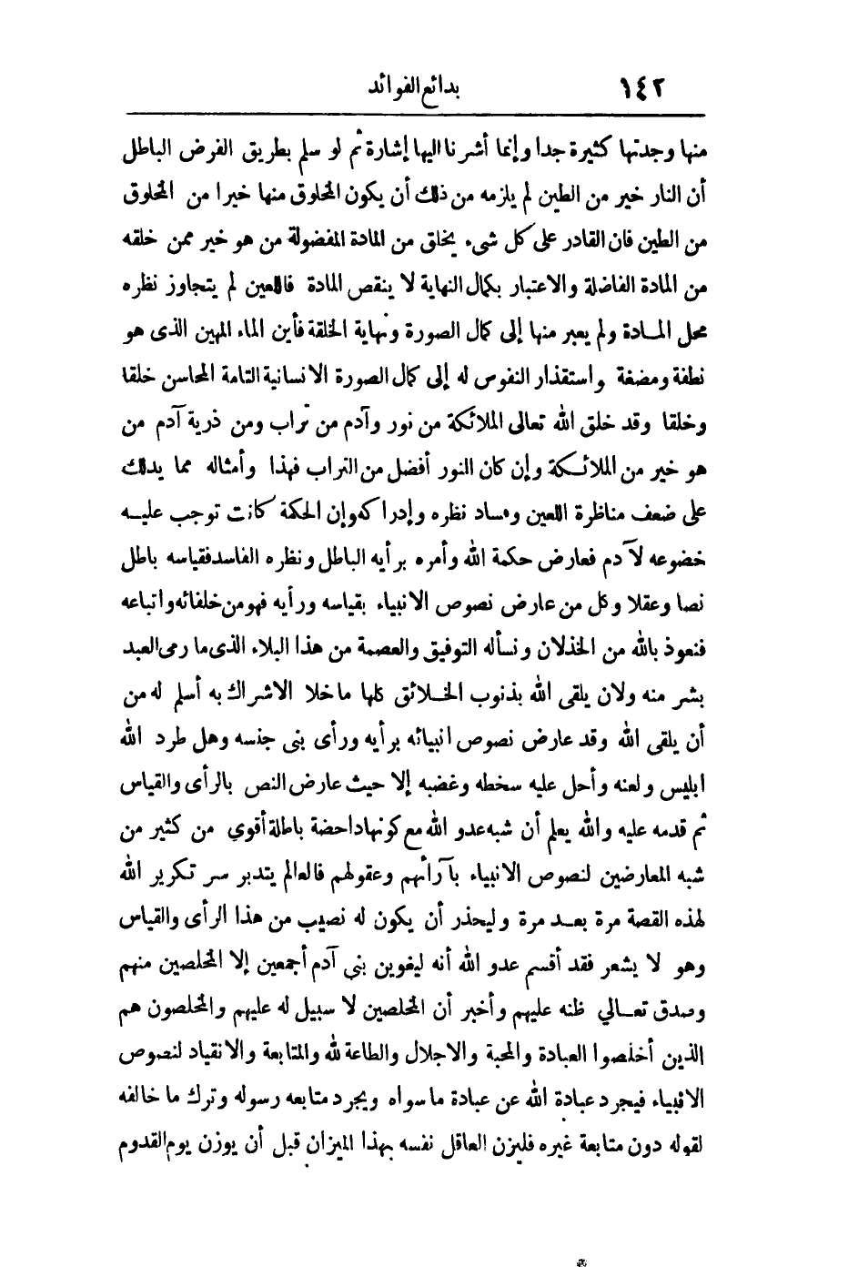 منها وجدتها كثيرة جدا وإنما أشرنا إليها إشارة ثم لو سلم بطريق الفرض الباطل أن النار خير من الطين لم يلزمه من ذلك أن يكون المخلوق منها خيرا من المخلوق من الطين فإن القادر على كل شيء يخلق من المادة المفضولة من هو خير ممن خلقه من المادة الفاضلة والاعتبار بكمال النهاية لا ينقص المادة فاللعين لم يتجاوز نظره محل المادة ولم يعبر منها إلى كمال الصورة ونهاية الخلقة فأين الماء المهين الذي هو نطفة ومضغة واستقذار النفوس له إلى كمال الصورة الإنسانية التامة المحاسن خلقا وخلقا وقد خلق الله تعالى الملائكة من نور وآدم من تراب ومنه ذرية آدم من هو خير من الملائكة وإن كان النور أفضل من التراب فهذا وأمثاله مما يدلك على ضعف مناظرة اللعين وفساد نظره وإدراكه وأن الحكمة كانت توجب عليه خضوعه لآدم فعارض حكمه الله وأمره برأيه الباطل ونظره الفاسد فقياسه باطل نصا وعقلا وكل من عارض نصوص الأنبياء بقياسه ورأيه فهو من خلفائه وأتباعه فنعوذ بالله من الخذلان ونسأله التوفيق والعصمة من هذا البلاء الذي ما رمي العبد بشر منه ولأن يلقي الله بذنوب الخلائق كلها ما خلا الإشراك به أسلم له من أن يلقي الله وقد عارض نصوص أنبيائه برأيه ورأي بنى جنسه وهل طرد الله تعالى إبليس ولعنه وأحل عليه سخطه وغضبه إلا حيث عارض النص بالرأي والقياس ثم قدمه عليه والله يعلم أن شبه عدو الله مع كونها داحضة باطلة أقوى من كثير من شبه المعارضين لنصوص الأنبياء بآرائهم وعقولهم فالعالم يتدبر سر تكرير الله تعالى لهذه القصة مرة بعد مرة وليحذر أن يكون له نصيب من هذا الرأي والقياس وهو لا يشعر فقد أقسم عدو الله أنه ليغوين بنى آدم أجمعين إلا المخلصين منهم وصدق تعالى ظنه عليهم وأخبر أن المخلصين لا سبيل له عليهم والمخلصون هم الذين أخلصوا العبادة والمحبة والإجلال والطاعة لله والمتابعة والانقياد لنصوص الأنبياء فيجرد عبادة الله عن عبادة ما سواه ويجرد متابعة رسوله وترك ما خالفه لقوله دون متابعة غيره فليزن العاقل نفسه بهذا الميزان قبل أن يوزن يوم القدوم
