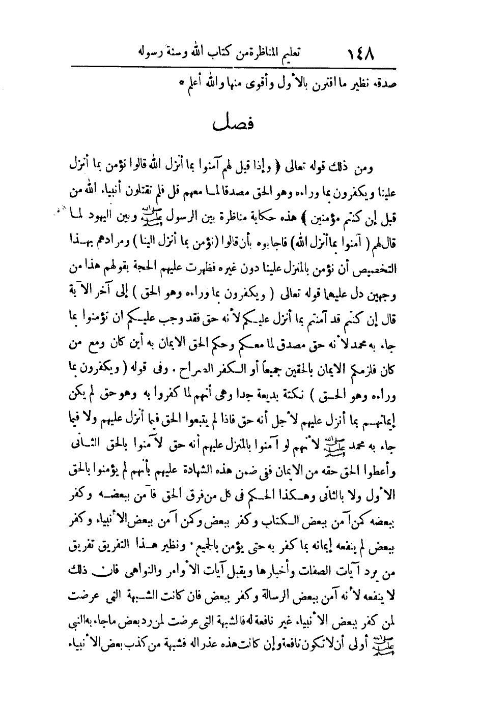 ومن ذلك قوله تعالى: {وَإِذَا قِيلَ لَهُمْ آمِنُوا بِمَا أَنْزَلَ اللَّهُ قَالُوا نُؤْمِنُ بِمَا أُنْزِلَ عَلَيْنَا وَيَكْفُرُونَ بِمَا وَرَاءَهُ وَهُوَ الْحَقُّ مُصَدِّقاً لِمَا مَعَهُمْ قُلْ فَلِمَ تَقْتُلُونَ أَنْبِيَاءَ اللَّهِ مِنْ قَبْلُ إِنْ كُنْتُمْ مُؤْمِنِينَ} هذه حكاية مناظرة بين الرسول وبين اليهود لما قال لهم آمنوا بما أنزل الله تعالى فأجابوه بأن قالوا {نُؤْمِنُ بِمَا أُنْزِلَ عَلَيْنَا} ومرادهم بهذا التخصيص أن نؤمن بالمنزل علينا دون غيره فظهرت عليهم الحجة بقولهم هذا من وجهين دل عليهما قوله تعالى: {وَيَكْفُرُونَ بِمَا وَرَاءَهُ وَهُوَ الْحَقُّ} إلى آخر الآية. قال إن كنتم قد آمنتم بما أنزل عليكم لأنه حق فقد وجب عليكم أن تؤمنوا بما جاء به محمد لأنه حق مصدق لما معكم وحكم الحق الإيمان به أين كان ومع من كان فلزمكم الإيمان بالحقين جميعا أو الكفر الصراح وفي وقوله: {وَيَكْفُرُونَ بِمَا وَرَاءَهُ وَهُوَ الْحَقُّ} نكتة بديعة جدا وهي أنهم لما كفروا به وهو حق لم يكن إيمانهم بما انزل عليهم لأجل أنه حق فإذا لم يتبعوا الحق فيما أنزل عليهم ولا فيما جاء به محمد لأنهم لو آمنوا بالمنزل عليهم أنه حق لآمنوا بالحق الثاني وأعطوا الحق حقه من الإيمان ففي ضمن هذه الشهادة عليهم بأنهم لم يؤمنوا بالحق الأول ولا بالثاني وهكذا الحكم في كل من فرق الحق فآمن ببعضه وكفر ببعضه كمن آمن ببعض الكتاب وكفر ببعض وكمن آمن ببعض الأنبياء وكفر ببعض لم ينفعه إيمانه بما كفر به حتى يؤمن بالجميع.