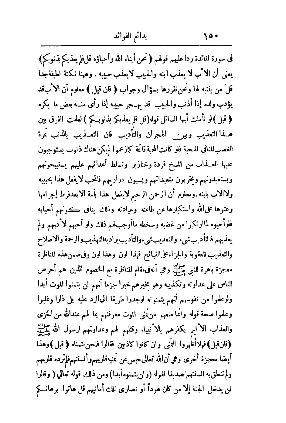 وههنا نكتة لطيفة جدا قل من ينتبه لها نحن نقررها بسؤال وجواب فإن قيل معلوم أن الأب قد يؤدب ولده إذا أذنب والحبيب قد يهجر حبيبه إذا رأى منه بعض ما يكره قيل لو تأملت أيها السائل قوله: {قُلْ فَلِمَ يُعَذِّبُكُمْ بِذُنُوبِكُمْ} لعلمت الفرق بين هذا التعذيب وبين الهجران والتأديب فإن التعذيب بالذنب ثمرة الغضب المنافي للمحبة فلو كانت المحبة قائمة كما زعموا لم يكن هناك ذنوب يستوجبون عليها العذاب من المسخ قردة وخنازير وتسلط أعدائهم عليهم يستبيحونهم يستعبدونهم ويخربون متعبداتهم ويسبون ذراريهم فالمحب لا يفعل هذا بحبيبه ولا الأب بابنه ومعلوم أن الرحمن الرحيم لا يفعل هذا بأمه إلا بعد فرط إجرامها وعتوها على الله واستكبارها عن طاعته وعبادته وذلك ينافى كونهم أحبابه فلو أحبوه لما ارتكبوا من غضبه وسخطه ما أوجب لهم ذلك ولو أحبهم لأدبهم ولم يعذبهم فالتأديب شيء والتعذيب شيء والتأديب يراد به التهذيب والرحمة والإصلاح والتعذيب للعقوبة والجزاء على القبائح فهذا لون وهذا لون وفي ضمن هذه المناظرة معجزة باهرة للنبي وهي أنه في مقام المناظرة مع الخصوم الذين هم أحرص الناس على عداوته وتكذيبه وهو يخبرهم خبرا جزما أنهم لن يتمنوا الموت أبدا ولو علموا من نفوسهم أنهم يتمونه لوجدوا طريقا إلى الرد عليه بل ذلوا وغلبوا وعلموا صحة قوله وإنما منعهم من تمنى الموت معرفته بما لهم عند الله تعالى من الخزي والعذاب الأليم بكفرهم بالأنبياء وقتلهم لهم وعداوتهم لرسول الله.