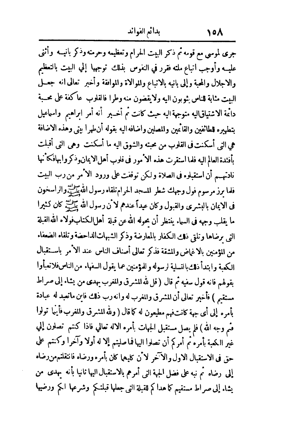 جرى لموسى مع قومه ثم ذكر البيت الحرام وتعظيمه وحرمته وذكر بانيه وأثنى عليه وأوجب اتباع ملته فقرر في النفوس بذلك توجهها إلى البيت بالتعظيم والإجلال والمحبة وإلى بانيه بالاتباع والموالاة والموافقة وأخبر تعالى أنه جعل البيت مثابة للناس يثوبون إليه ولا يقضون منه وطرا فالقلوب عاكفة على محبته دائمة الاشتياق إليه متوجهة إليه حيث كانت ثم أخبر أنه أمر إبراهيم وإسماعيل بتطهيره للطائفين والقائمين والمصلين وأضافه إليه بقوله: {أَنْ طَهِّرَا بَيْتِيَ} وهذه الإضافة هي التي أسكنت في القلوب من محبته والشوق إليه ما أسكنت وهي التي أقبلت بأفئدة العالم إليه فلما استقرت هذه الأمور في قلوب أهل الإيمان وذكروا بها فكأنها نادتهم أن استقبلوه في الصلاة ولكن توقفت على ورود الأمر من رب البيت فلما برز مرسوم فول وجهك شطر المسجد الحرام تلقاه رسول الله والراسخون في الإيمان بالبشرى والقبول وكان عيدا عندهم لأن رسول الله كان كثيرا ما يقلب وجهه في السماء ينتظر أن يحول الله عن قبلة أهل الكتاب فولاه الله القبلة التي يرضاها وتلقى ذلك الكفار بالمعارضة وذكر الشبهات الداحضة وتلقاه الضعفاء من المؤمنين بالإغماض والمشقة فذكر تعالى أصناف الناس عند الأمر باستقبال الكعبة وابتداء ذلك بالتسلية لرسوله وللمؤمنين عما يقول السفهاء من الناس فلا تعبأوا بقولهم فإنه قول سفيه ثم قال: {قُلْ لِلَّهِ الْمَشْرِقُ وَالْمَغْرِبُ يَهْدِي مَنْ يَشَاءُ إِلَى صِرَاطٍ مُسْتَقِيمٍ} فأخبر تعالى أن المشرق والمغرب له أنه رب ذلك فأياًّ ما تعبد له عبادة بأمره إلى أي جهة كانت فهم مطيعون له كما قال: {وَلِلَّهِ الْمَشْرِقُ وَالْمَغْرِبُ فَأَيْنَمَا تُوَلُّوا فَثَمَّ وَجْهُ اللَّهِ} فلم يصل مستقبل الجهات بأمره إلا له تعالى فإذا كنتم تصلون إلى غير الكعبة بأمره ثم أمركم أن تصلوا إليها فما صليتم إلا له أولا وآخرا وكنتم على حق في الاستقبال الأول والآخر لأن كليهما كان بأمره ورضاه فانتقلتم من رضاه ثم نبه على فضل الجهة التي أمرهم بالاستقبال إليها ثانيا بأنه يهدي من يشاء إلى صراط مستقيم كما هداكم للقبلة التي جعلها قبلتكم وشرعا لكم ورضيها