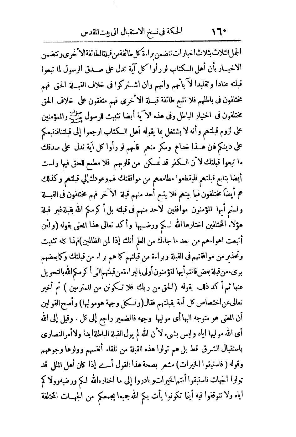 الجمل الثلاث بثلاث إخبارات تتضمن براءة كل طائفة من قبله الطائفة الأخرى وتتضمن الأخبار بأن أهل الكتاب لو رأوا كل آية تدل على صدق الرسول لما تبعوا قبلته عنادا وتقليدا لآبائهم وأنهم إن اشتركوا في خلاف القبلة الحق منهم مختلون مختلفون في باطلهم فلا تتبع طائفة قبلة الأخرى فهم متفقون على خلاف الحق في اختيار الباطل وفي هذه الآية أيضا ثبيت للرسول والمؤمنين على لزوم قبلتهم وأنه لا يشتغل بما يقوله أهل الكتاب ارجعوا إلى قبلتنا فنتبعكم على دينكم فإن هذا خداع ومكر منهم فإنهم لو رأوا كل آية تدل على صدقك ما تبعوا قبلتك لأن الكفر قد تمكن من قلوبهم فلا مطمع للحق فيها ولست أيضا بتابع قبلتهم فليقطعوا مطامعهم من موافقتك لهم وعودك إلى قبلتهم وكذلك هم أيضا مختلفون فيما بينهم فلا يتبع أحد منهم قلبة الآخر فهم مختلفون في القبلة ولستم أيها المؤمنون موافقين لأحد منهم في قبلته بل أكرمكم الله بقبلة غير قبلة هؤلاء المختلفين اختارها الله لكم ورضيها وأكد تعالى هذا المعنى بقوله: {وَلَئِنِ اتَّبَعْتَ أَهْوَاءَهُمْ مِنْ بَعْدِ مَا جَاءَكَ مِنَ الْعِلْمِ إِنَّكَ إِذاً لَمِنَ الظَّالِمِينَ} فهذا كله تثبيت وتحذير من موافقتهم في القبلة وبراءة من قبلتهم كما هم براء من قبلتك وكما بعضهم بريء من قبله بعض فأنتم أيها المؤمنون أولى بالبراءة من قبلتهم التي أكرمكم الله تعالى بالتحويل عنها ثم أكد ذلك بقوله: {الْحَقُّ مِنْ رَبِّكَ فَلا تَكُونَنَّ مِنَ الْمُمْتَرِينَ} ثم أخبر تعالى عن اختصاص كل أمة بقبلتهم فقال: {وَلِكُلٍّ وِجْهَةٌ هُوَ مُوَلِّيهَا} وأصح القولين أن المعنى هو متوجه إليها أي موليها وجهه فالضمير راجع إلى كل، وقيل إلى الله اي الله موليها إياه وليس بشيء لأن الله لم يول القبلة الباطلة أبدا ولا أمر النصارى باستقبال الشرق قط بل هم تولوا هذه القبلة من تلقاء أنفسهم وولوها وجوههم وقوله: {فَاسْتَبِقُوا الْخَيْرَاتِ} مشعر بصحة هذا القول أي إذا كان أهل الملل قد تولوا الجهات فاستقبوا أنتم الخيرات وبادروا إلى ما اختاره الله لكم ورضيه وولاكم إياه ولا تتوقفوا فيه {أَيْنَ مَا تَكُونُوا يَأْتِ بِكُمُ اللَّهُ جَمِيعاً} يجمعكم من الجهات المختلفة