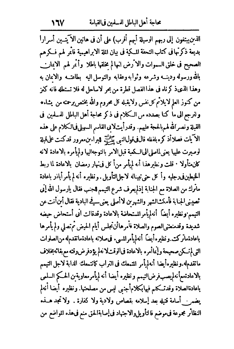 الَّذِينَ يَدْعُونَ يَبْتَغُونَ إِلَى رَبِّهِمُ الْوَسِيلَةَ أَيُّهُمْ أَقْرَبُ} على أن في هاتين الآيتين أسرارا بديعة ذكرتها في كتاب التحفة المكية في بيان الملة الإبراهيمية فأثمر لهم فكرهم الصحيح في خلق السموات والأرض أنه لم يخلقها باطلا وأثمر لهم الإيمان بالله ورسوله ودينه وشرعه وثوابه وعقابه والتوسل إليه بطاعته والإيمان به وهذا الذي ذكرناه في هذا الفصل قطرة من بحر لا ساحل له فلا تستطله فإنه كنز من كنوز العلم لا يلائم كل نفس ولا يقبله كل محروم والله يختص برحمته من يشاء ولنرجع إلى ما كنا بصدده من الكلام في ذكر محاجه أهل الباطل للمسلمين في القبلة ونصر الله لهم بالحجة عليهم وقد رأيت لأبي القاسم السهيلي في الكلام على هذه الآيات فصلا اذكره بلفظه قال في قول النبي صلى الله عليه وسلم للبراء بن معرور: "قد كنت على قبلة لو صبرت عليها" يعنى لما صلى إلى الكعبة المشرفة قبل الأمر بالتوجه إليها ولم يأمره بالإعادة لأنه كان متأولا.